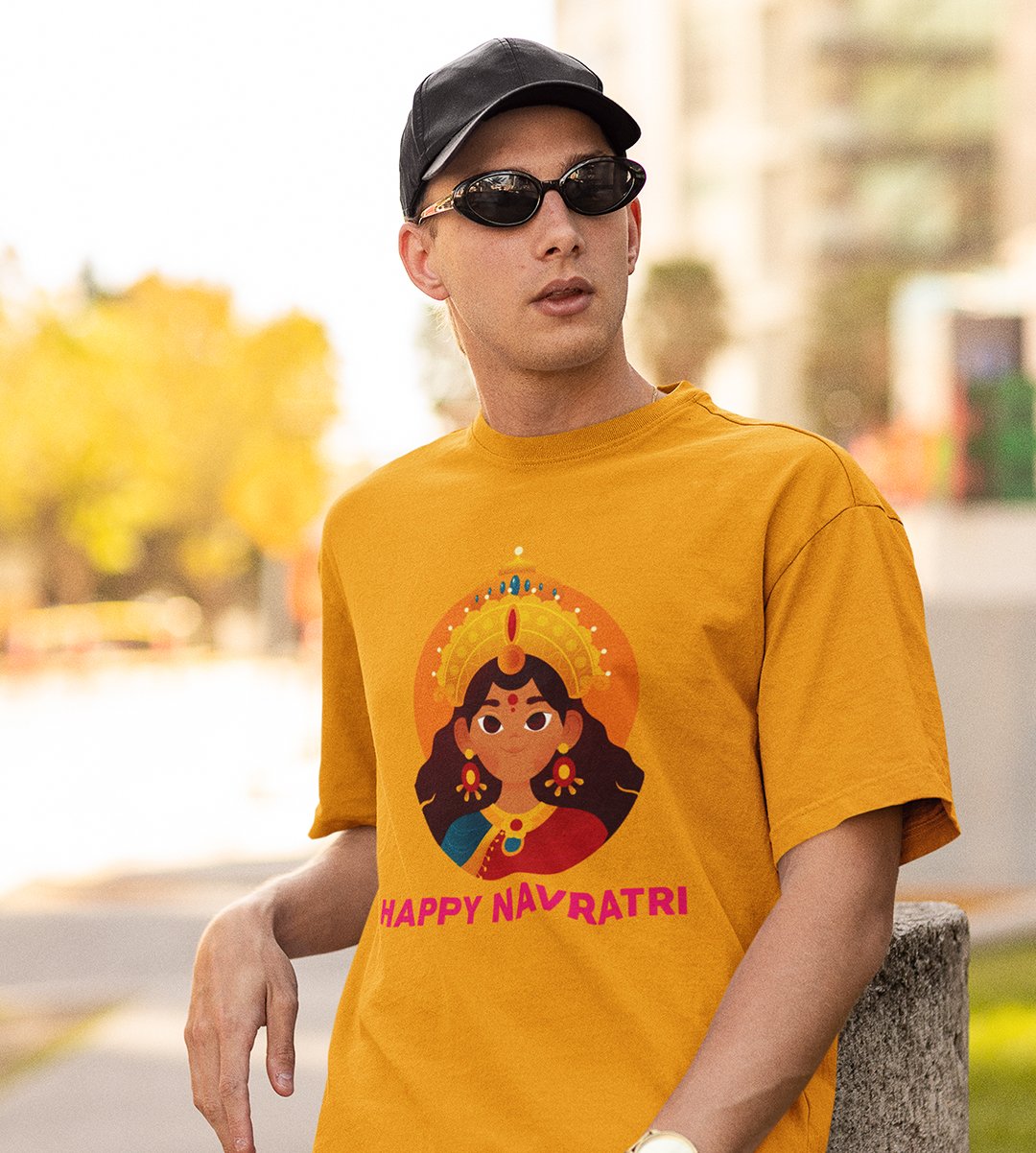 Navratri is a very auspicious festival for hindus. It takes place at the beginning of October and sometimes September. Enjoy the 9 days of festivities with full zeal and make yourself submerged in the love of Maa Durga. Navratri is also known as Durga Puja. And with this Tees, you can shine like a star during this festive season with our navratri themed cotton half sleeved Tshirts. You can pair our t-shirts with trousers and denim of your choice and make it a weekday smart casual or weekend wear. This is durable. This tshirt is smooth and soft which makes you comfortable to wear during all seasons. The printing in it is durable and odourless. It has five sizes, S,M,L,XL,XXL. The Tshirt colour is intact even after repeated washes. It can be kept in your wardrobe and hangers. Please avoid washing mashine to clean this Tee, it may affect the print. Hand wash only. We have brought you many navratri related designs printed on our different colour Tshirts to choose from. Grab it now.