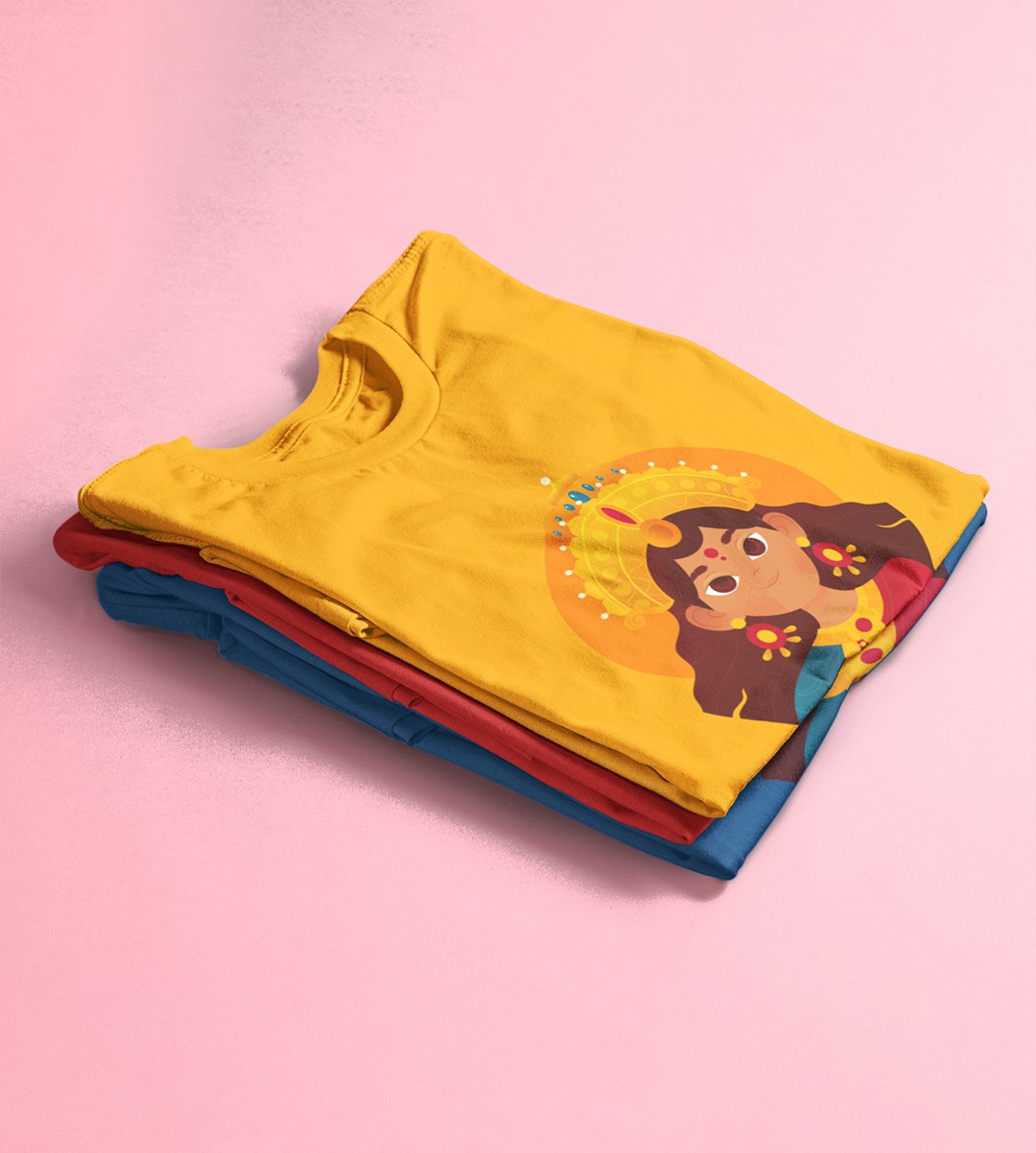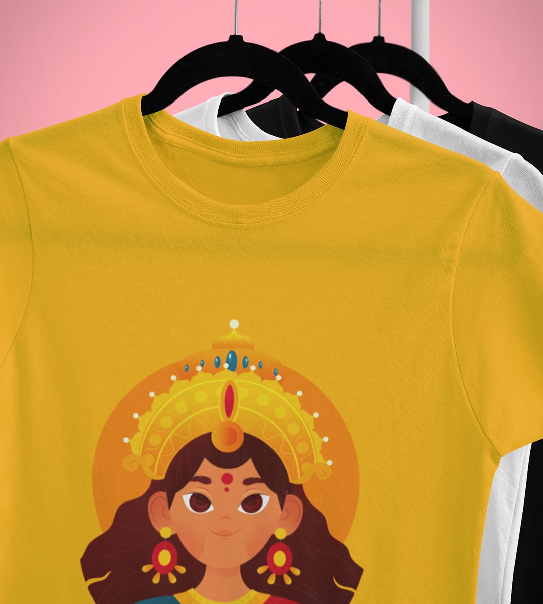 Durga ma animation face printed unisex adults round neck cotton half-sleeve yellow tshirt specially for Navratri festival/ Durga puja