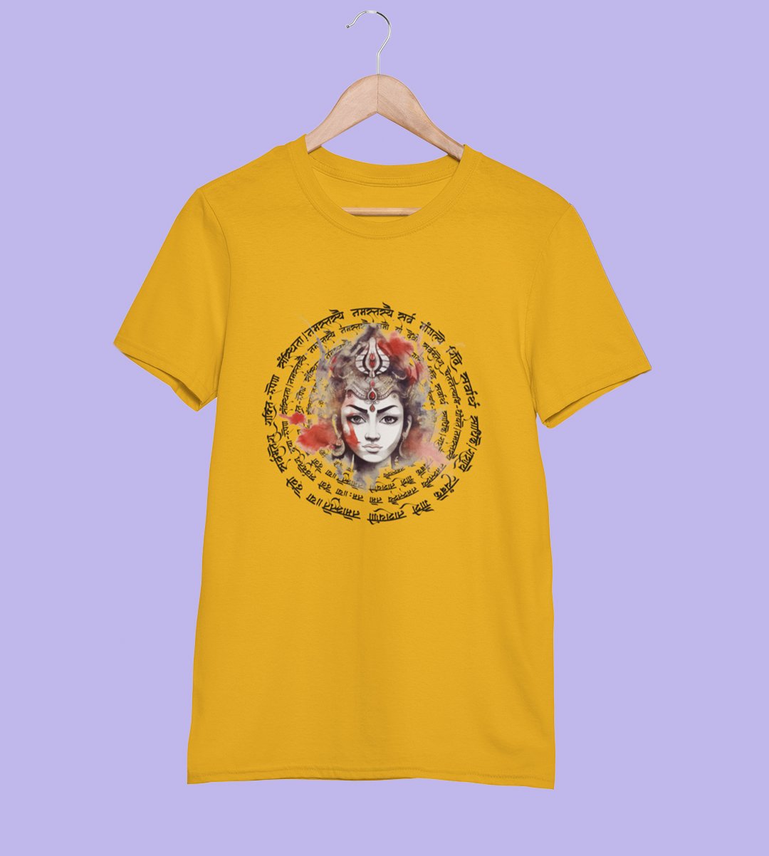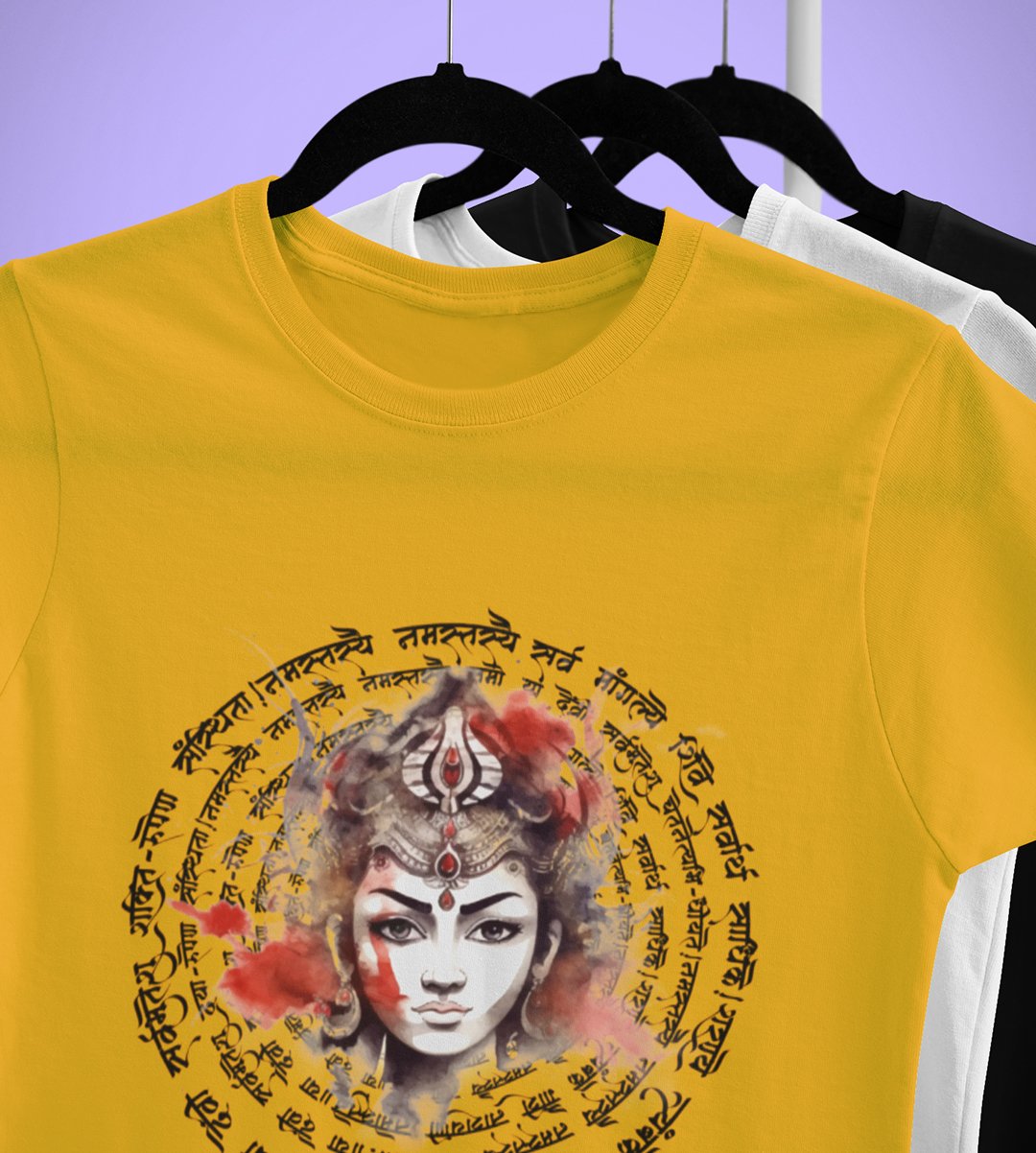 Durga maa and mantras printed unisex adults round neck cotton half-sleeve yellow tshirt specially for Navratri festival/ Durga puja