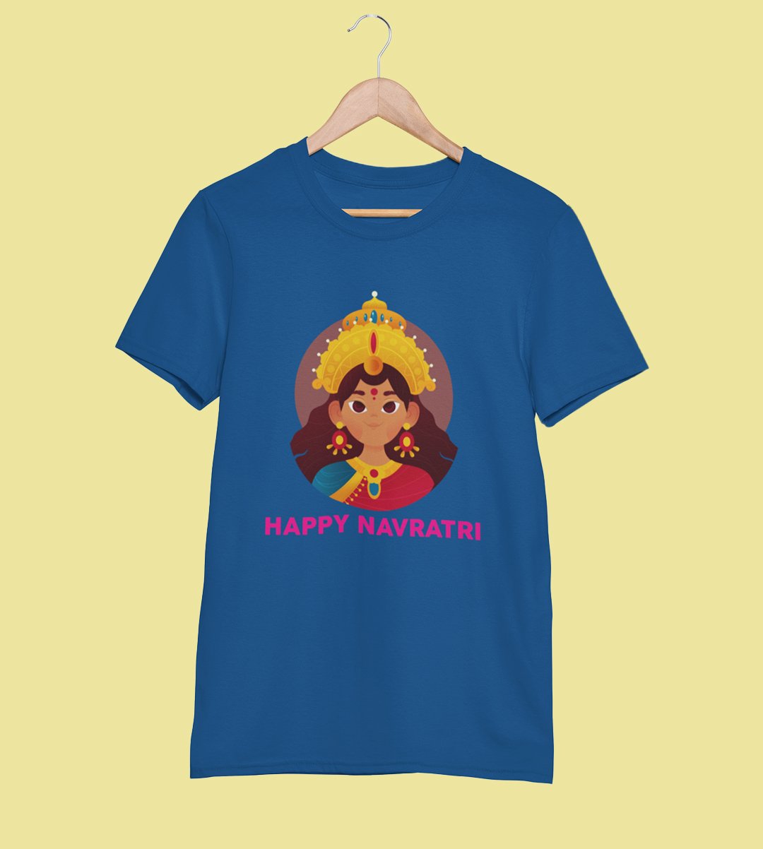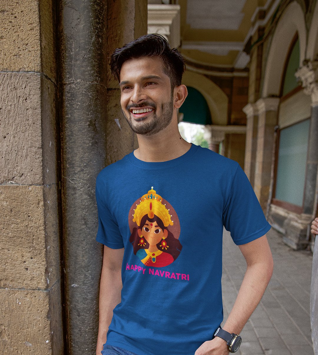Navratri is a very auspicious festival for hindus. It takes place at the beginning of October and sometimes September. Enjoy the 9 days of festivities with full zeal and make yourself submerged in the love of Maa Durga. Navratri is also known as Durga Puja. And with this Tees, you can shine like a star during this festive season with our navratri themed cotton half sleeved Tshirts. You can pair our t-shirts with trousers and denim of your choice and make it a weekday smart casual or weekend wear. This is durable. This tshirt is smooth and soft which makes you comfortable to wear during all seasons. The printing in it is durable and odourless. It has five sizes, S,M,L,XL,XXL. The Tshirt colour is intact even after repeated washes. It can be kept in your wardrobe and hangers. Please avoid washing mashine to clean this Tee, it may affect the print. Hand wash only. We have brought you many navratri related designs printed on our different colour Tshirts to choose from. Grab it now.