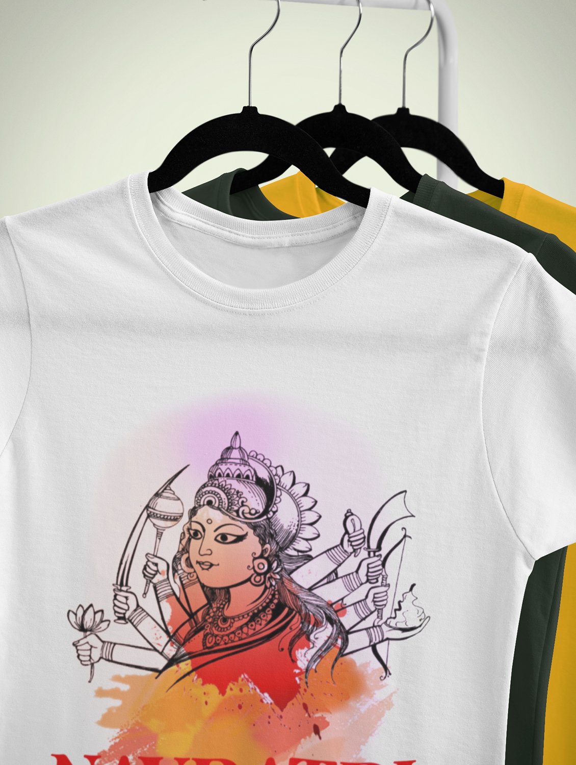 Navratri is a very auspicious festival for hindus. It takes place at the beginning of October and sometimes September. Enjoy the 9 days of festivities with full zeal and make yourself submerged in the love of Maa Durga. Navratri is also known as Durga Puja. And with this Tees, you can shine like a star during this festive season with our navratri themed cotton half sleeved Tshirts. You can pair our t-shirts with trousers and denim of your choice and make it a weekday smart casual or weekend wear. This is durable. This tshirt is smooth and soft which makes you comfortable to wear during all seasons. The printing in it is durable and odourless. It has five sizes, S,M,L,XL,XXL. The Tshirt colour is intact even after repeated washes. It can be kept in your wardrobe and hangers. Please avoid washing mashine to clean this Tee, it may affect the print. Hand wash only. We have brought you many navratri related designs printed on our different colour Tshirts to choose from. Grab it now.