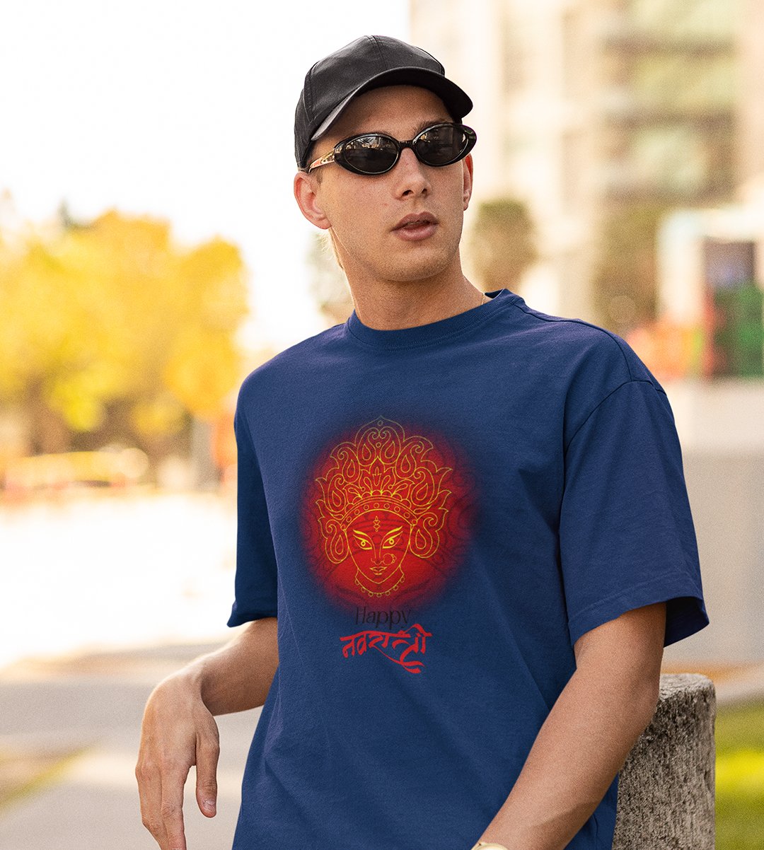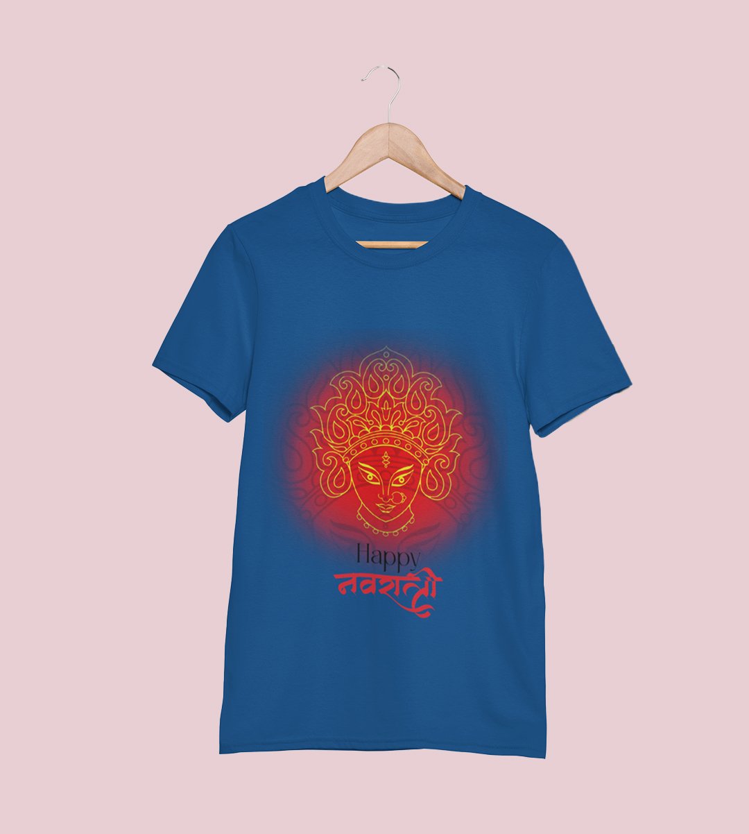 Navratri is a very auspicious festival for hindus. It takes place at the beginning of October and sometimes September. Enjoy the 9 days of festivities with full zeal and make yourself submerged in the love of Maa Durga. Navratri is also known as Durga Puja. And with this Tees, you can shine like a star during this festive season with our navratri themed cotton half sleeved Tshirts. You can pair our t-shirts with trousers and denim of your choice and make it a weekday smart casual or weekend wear. This is durable. This tshirt is smooth and soft which makes you comfortable to wear during all seasons. The printing in it is durable and odourless. It has five sizes, S,M,L,XL,XXL. The Tshirt colour is intact even after repeated washes. It can be kept in your wardrobe and hangers. Please avoid washing mashine to clean this Tee, it may affect the print. Hand wash only. We have brought you many navratri related designs printed on our different colour Tshirts to choose from. Grab it now.