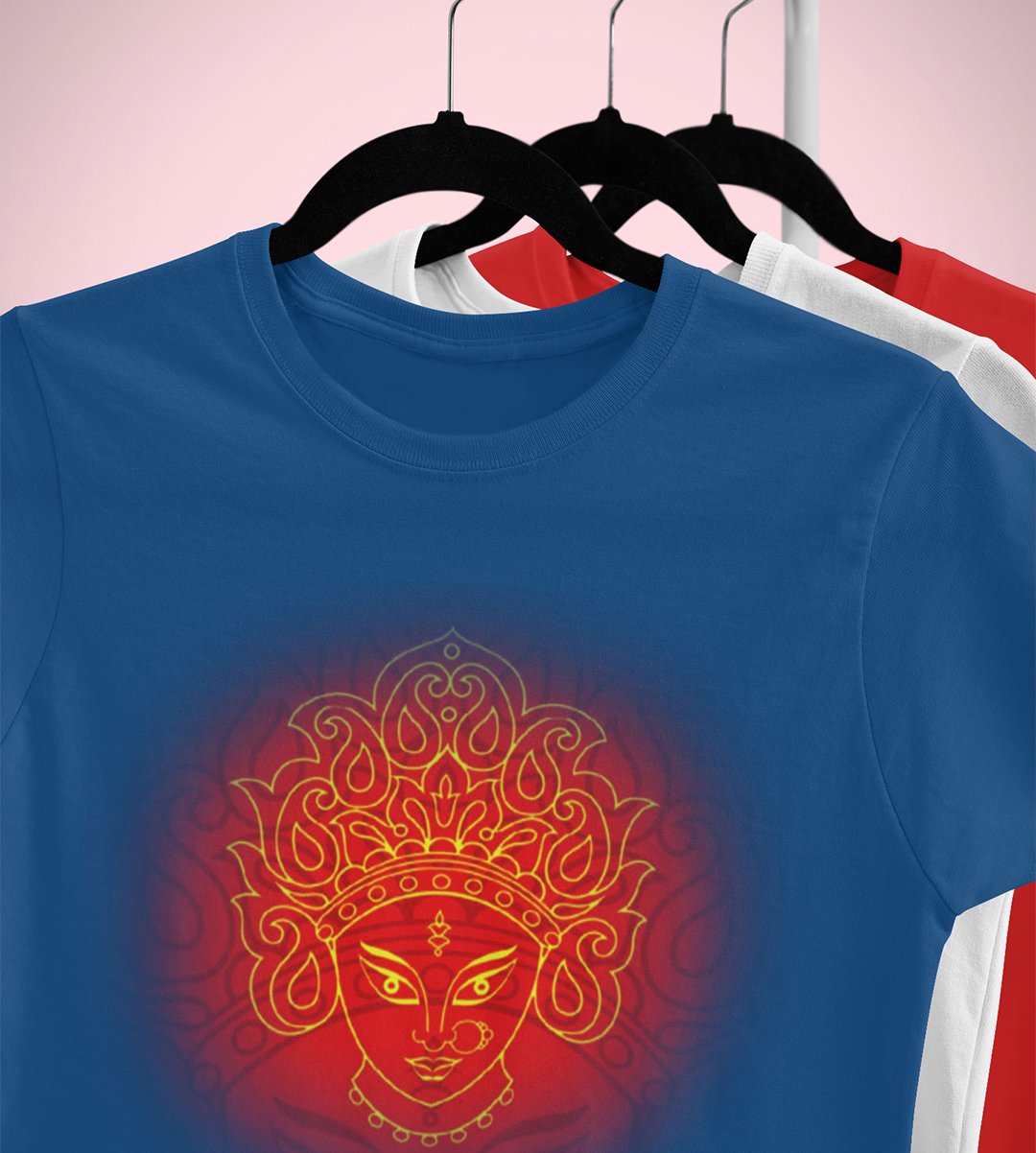 Durga maa face (Bright light) printed unisex adults round neck cotton half-sleeve blue tshirt specially for Navratri festival/ Durga puja