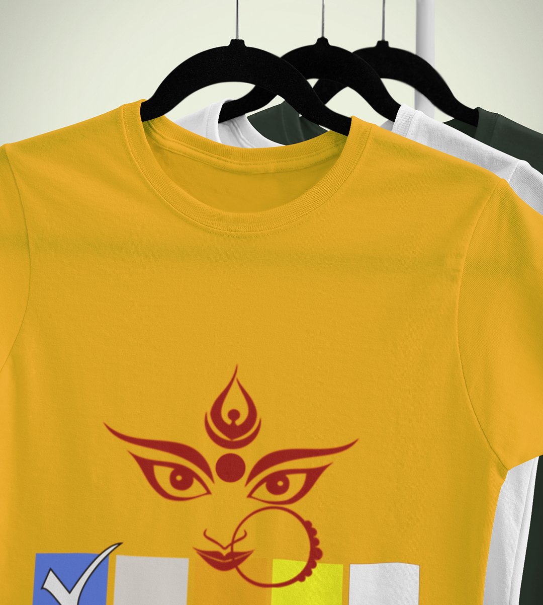 Durga maa face lining printed unisex adults round neck cotton half-sleeve yellow tshirt specially for Navratri festival/ Durga puja