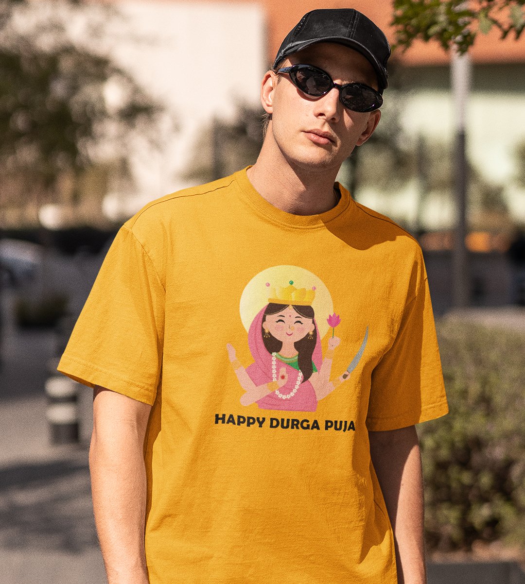Durga maa (pink) printed unisex adults round neck cotton half-sleeve yellow tshirt specially for Navratri festival/ Durga puja