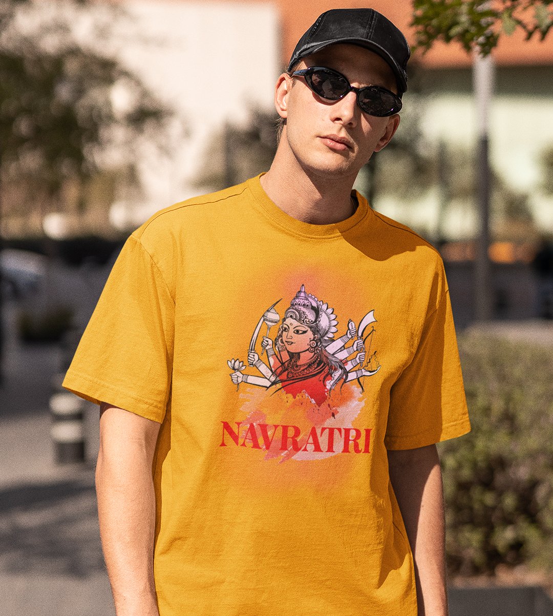 Navratri is a very auspicious festival for hindus. It takes place at the beginning of October and sometimes September. Enjoy the 9 days of festivities with full zeal and make yourself submerged in the love of Maa Durga. Navratri is also known as Durga Puja. And with this Tees, you can shine like a star during this festive season with our navratri themed cotton half sleeved Tshirts. You can pair our t-shirts with trousers and denim of your choice and make it a weekday smart casual or weekend wear. This is durable. This tshirt is smooth and soft which makes you comfortable to wear during all seasons. The printing in it is durable and odourless. It has five sizes, S,M,L,XL,XXL. The Tshirt colour is intact even after repeated washes. It can be kept in your wardrobe and hangers. Please avoid washing mashine to clean this Tee, it may affect the print. Hand wash only. We have brought you many navratri related designs printed on our different colour Tshirts to choose from. Grab it now.