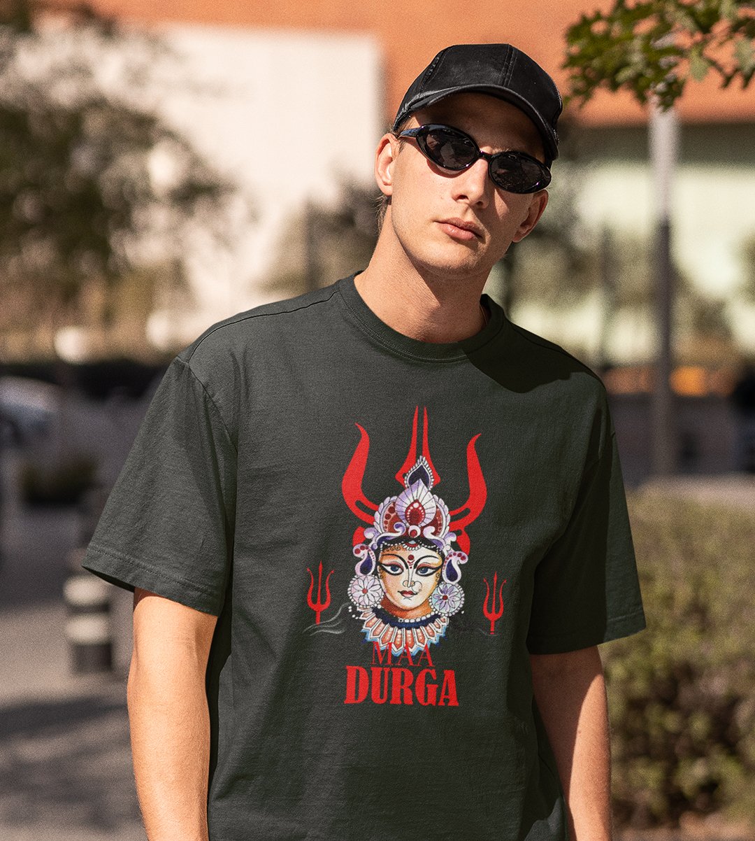 Durga maa waterpaint printed unisex adults round neck cotton half-sleeve green tshirt specially for Navratri festival/ Durga puja