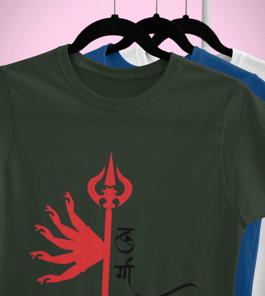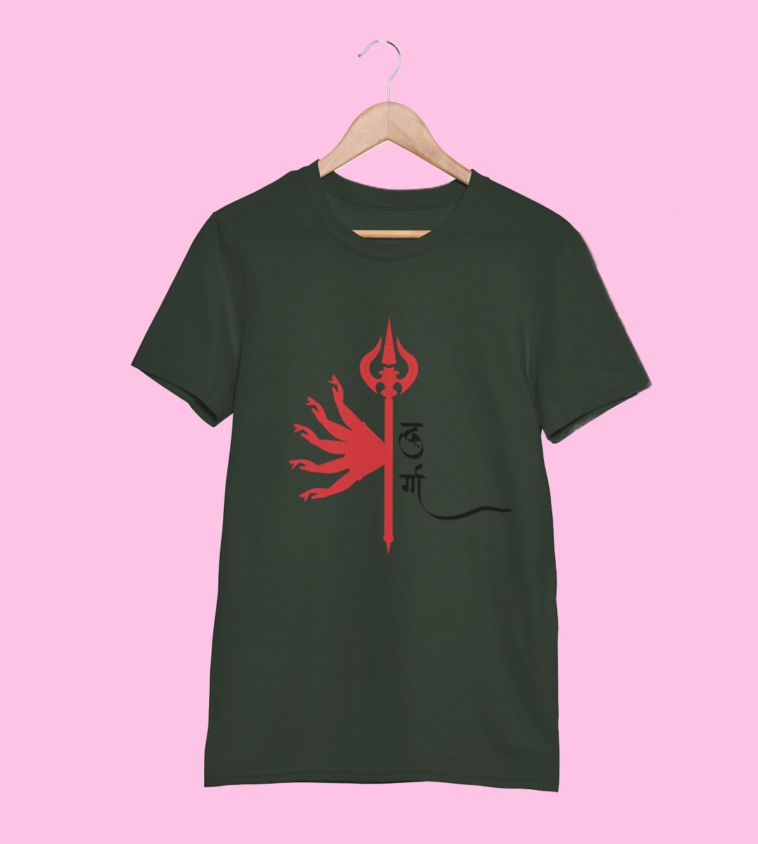 Durga (red trishul) printed unisex adults round neck cotton half-sleeve green tshirt specially for Navratri festival/ Durga puja