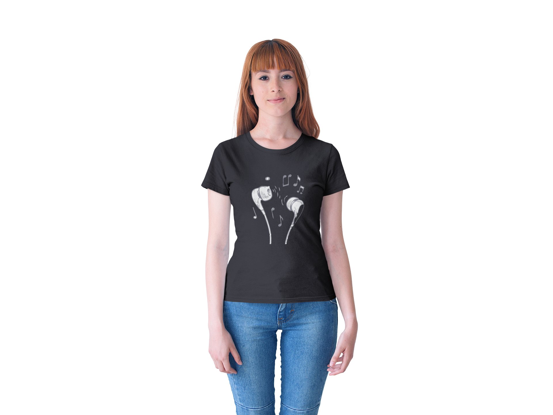 Earphones with Music Notes -Black - Women's - printed T-shirt - comfortable round neck Cotton