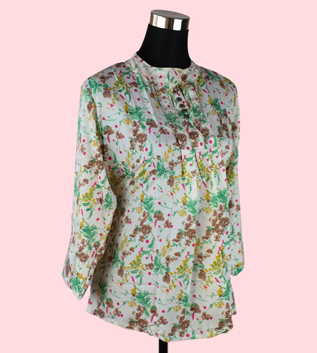 Elegant White and Cream Top with Green Floral Accents - Chic and Versatile