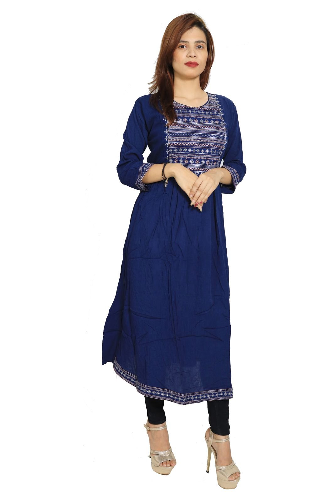 Curved straight lines embroided straight Kurti for Womens/ girls (Blue)- Made up of Rayon and designed for you plesant and comfy