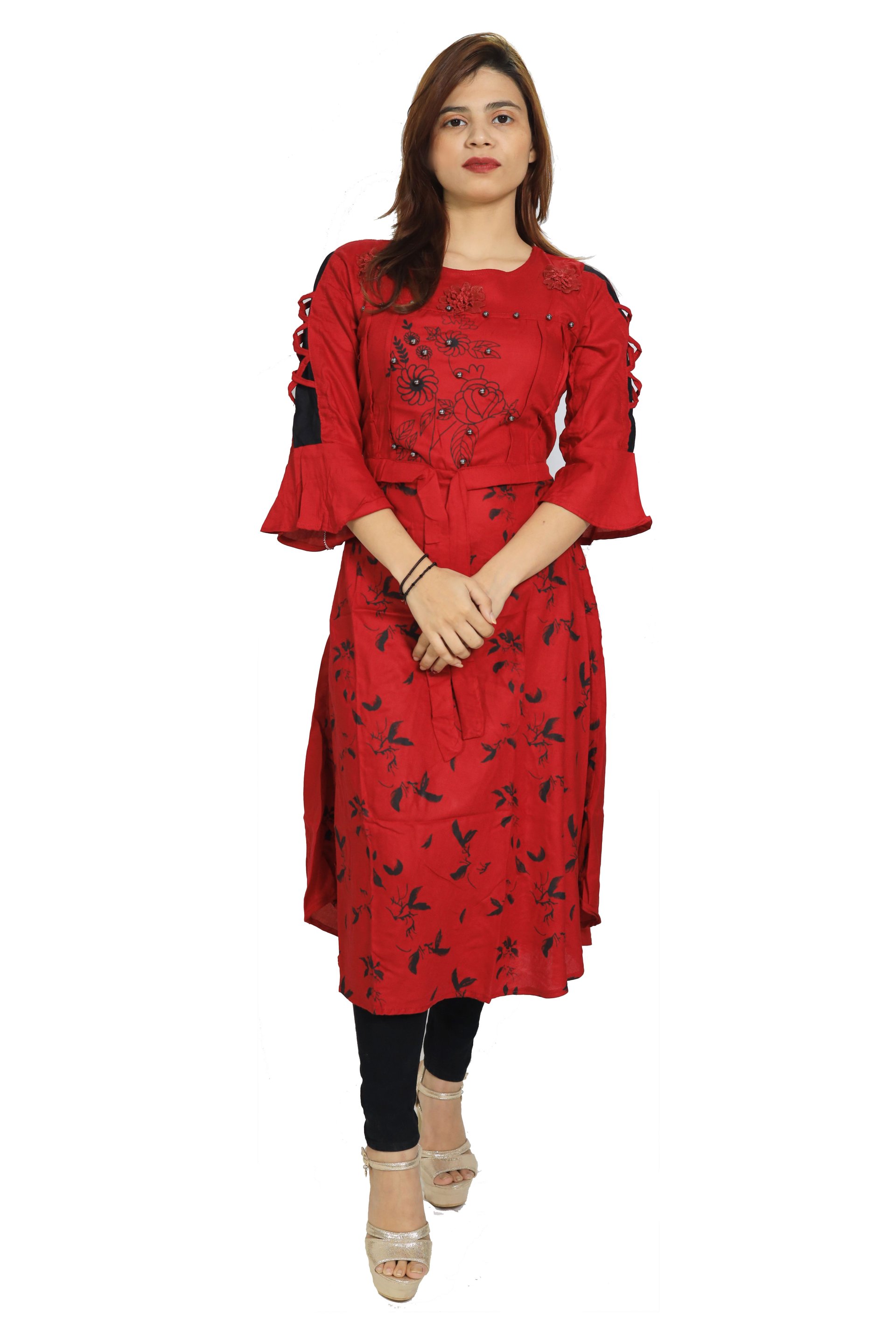Black lined flower embroided straight Kurti for Womens/ girls (Red)- Made up of Rayon and designed for you plesant and comfy