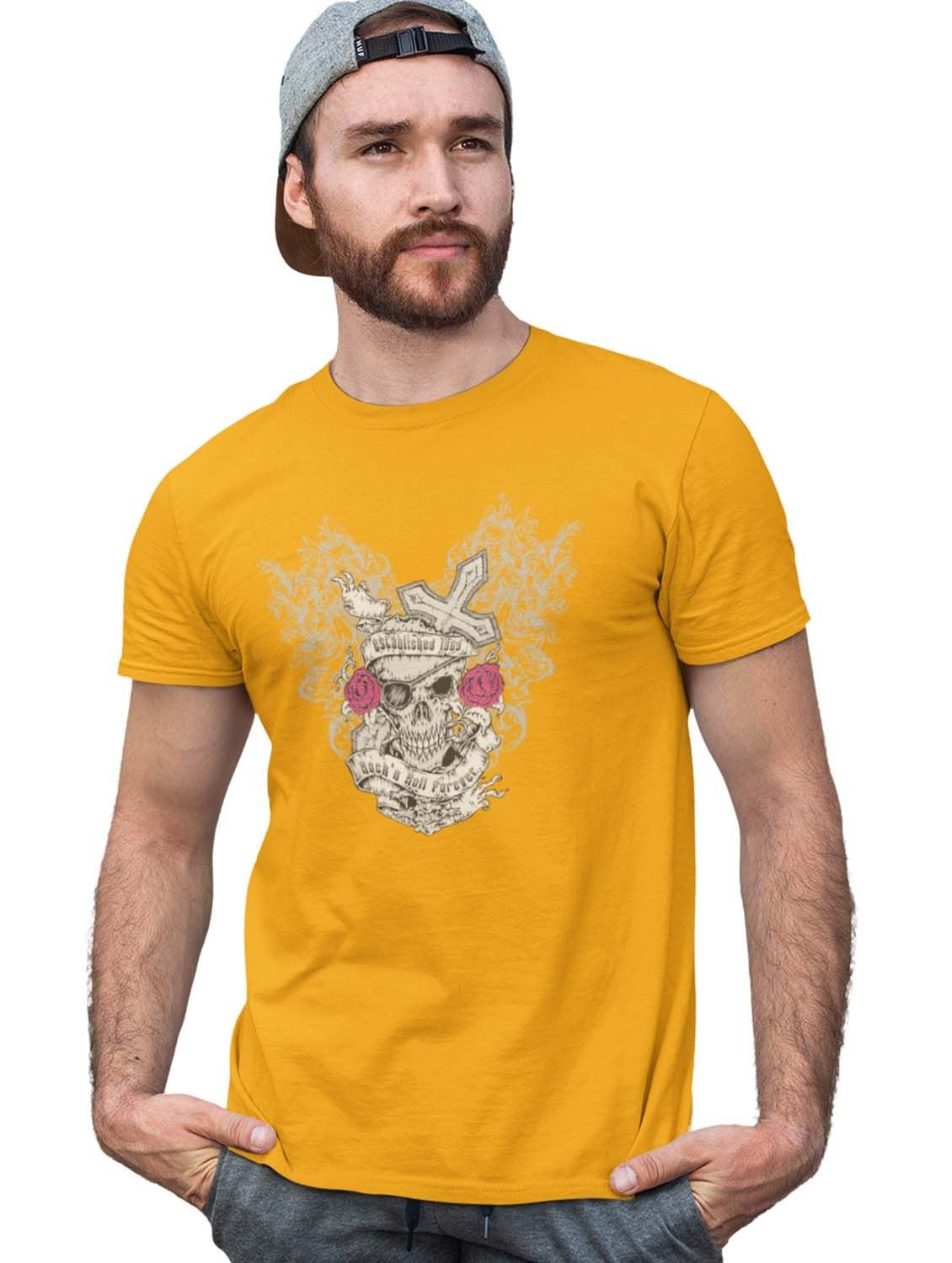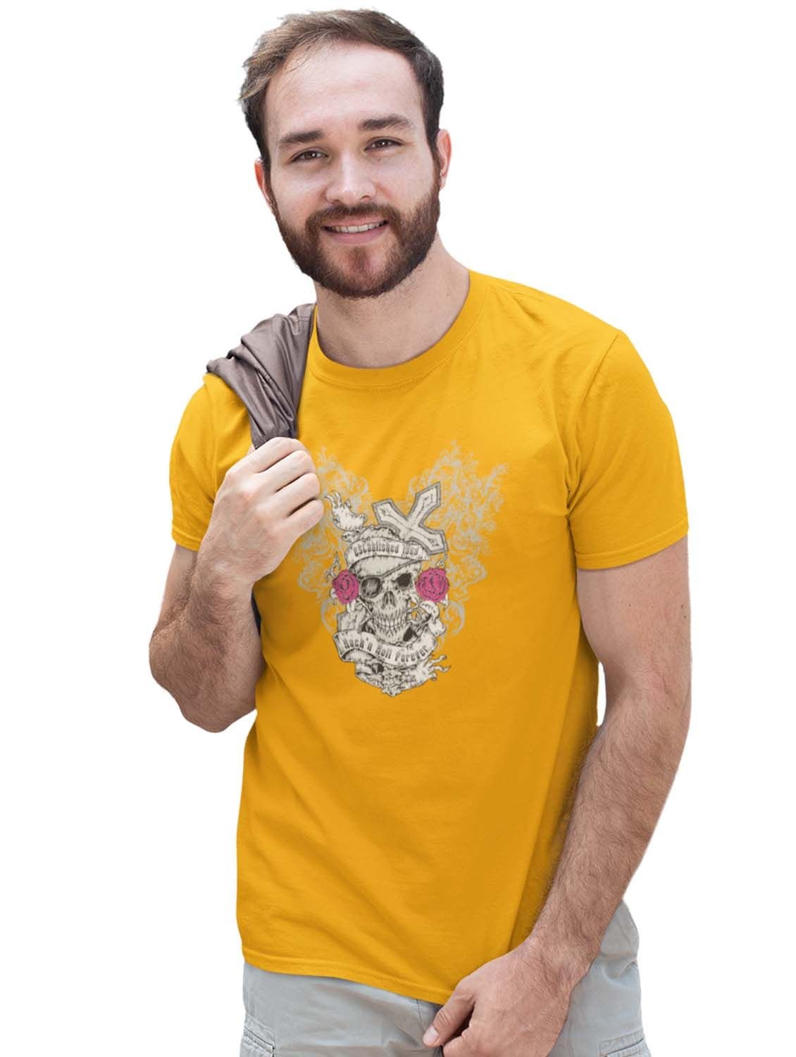 Rock N Roll Forever Yellow Round Neck Cotton Half Sleeved T-Shirt with Printed Graphics