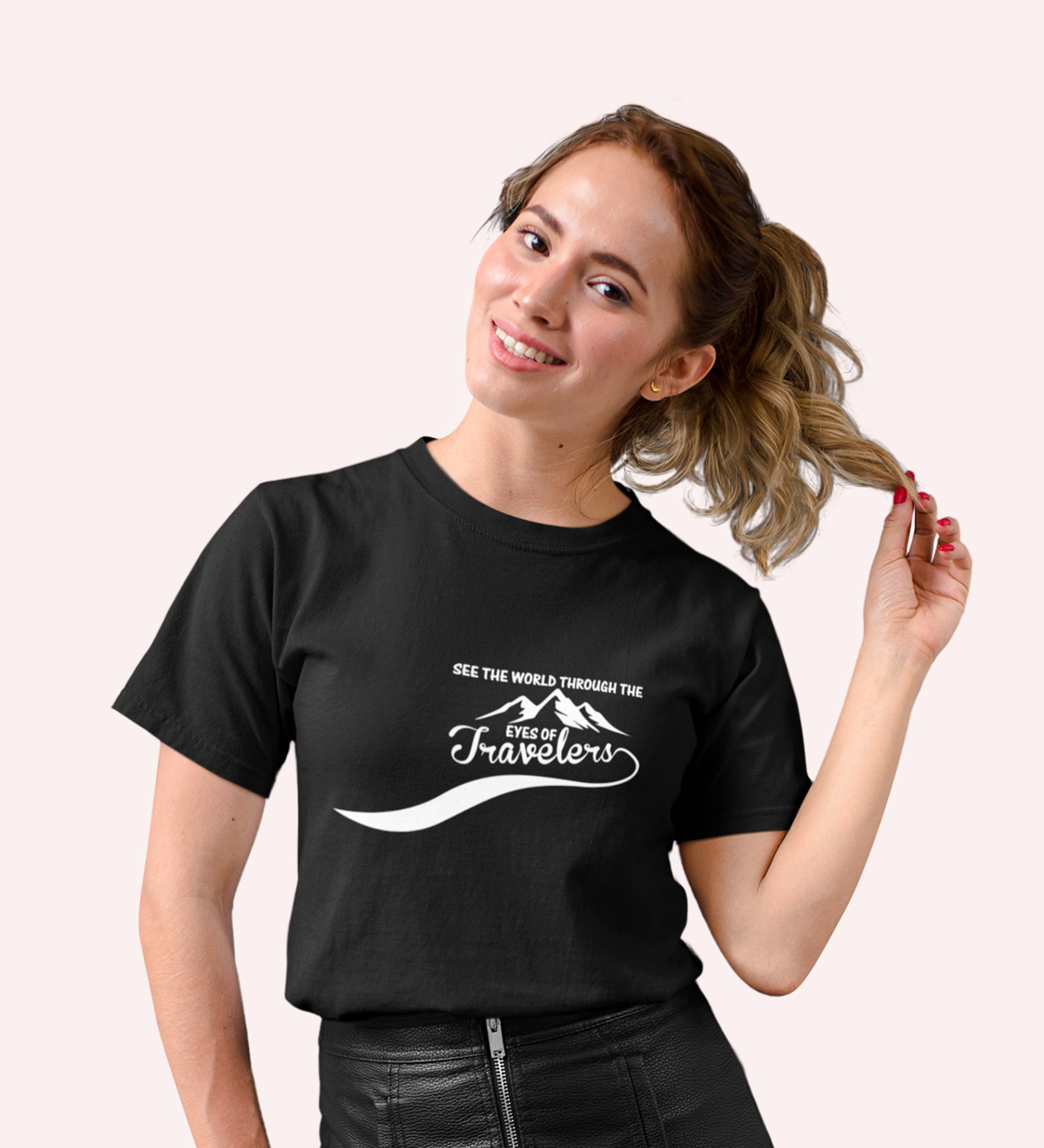 HopOfferEyes Of The Travellers Black Round Neck Cotton Half Sleeved Women's T-Shirt with Printed Graphics