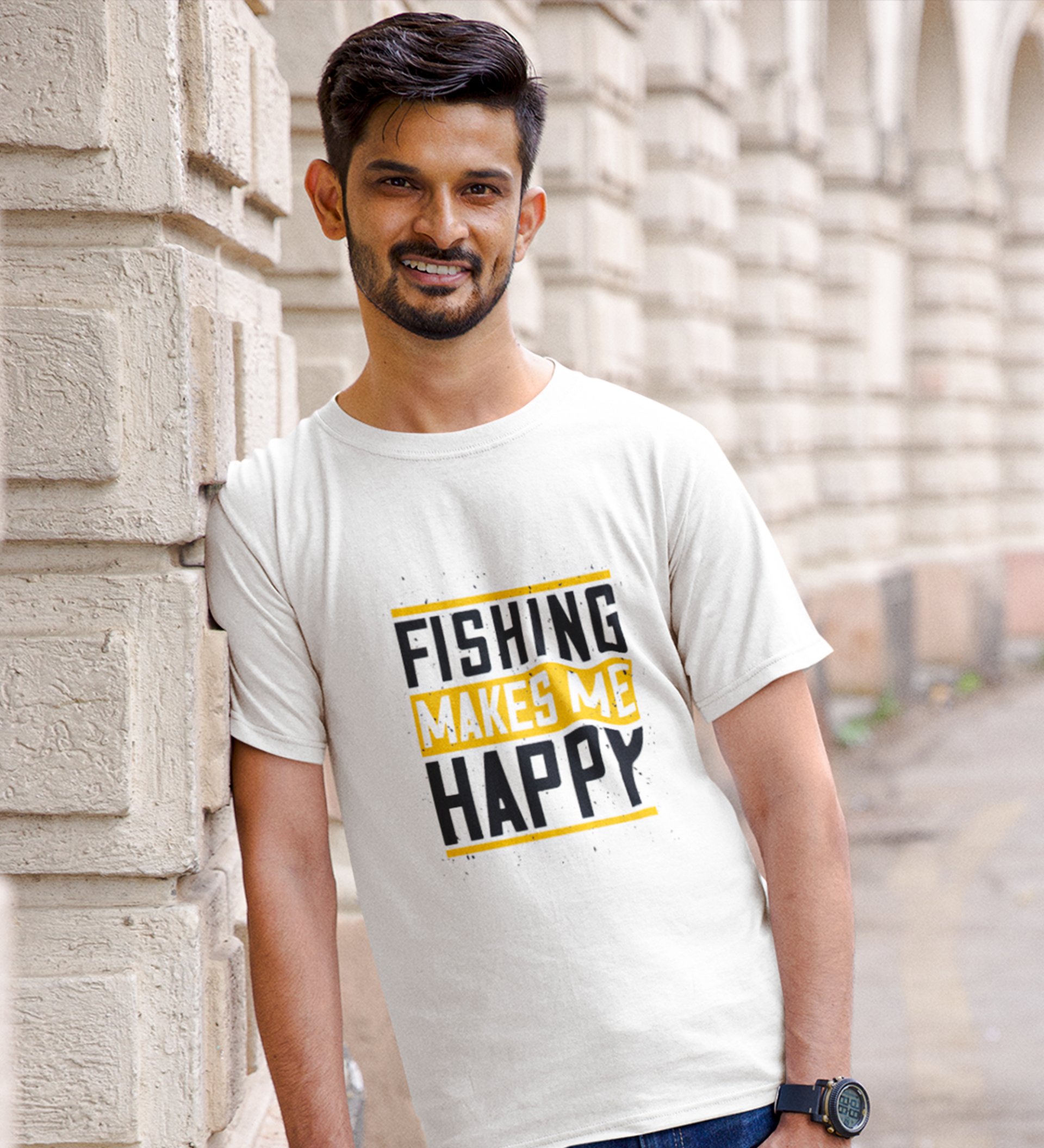Fishing Makes Me Happy White Round Neck Cotton Half Sleeved Men's T-Shirt with Printed Graphics
