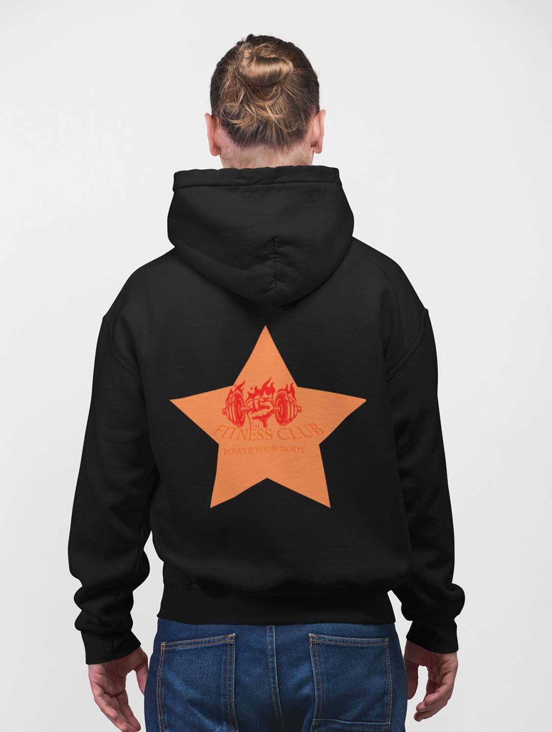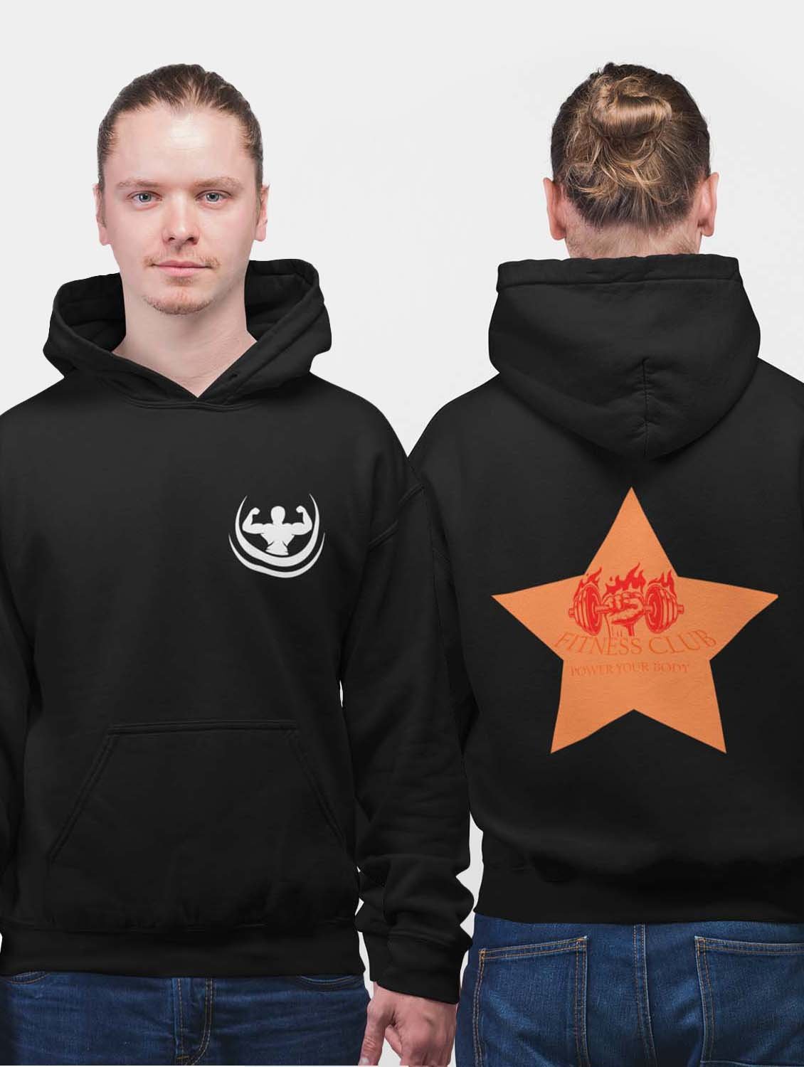 Fitness Club, Power Your Body, (BG Orange) printed artswear black hoodies for winter casual wear specially for Men