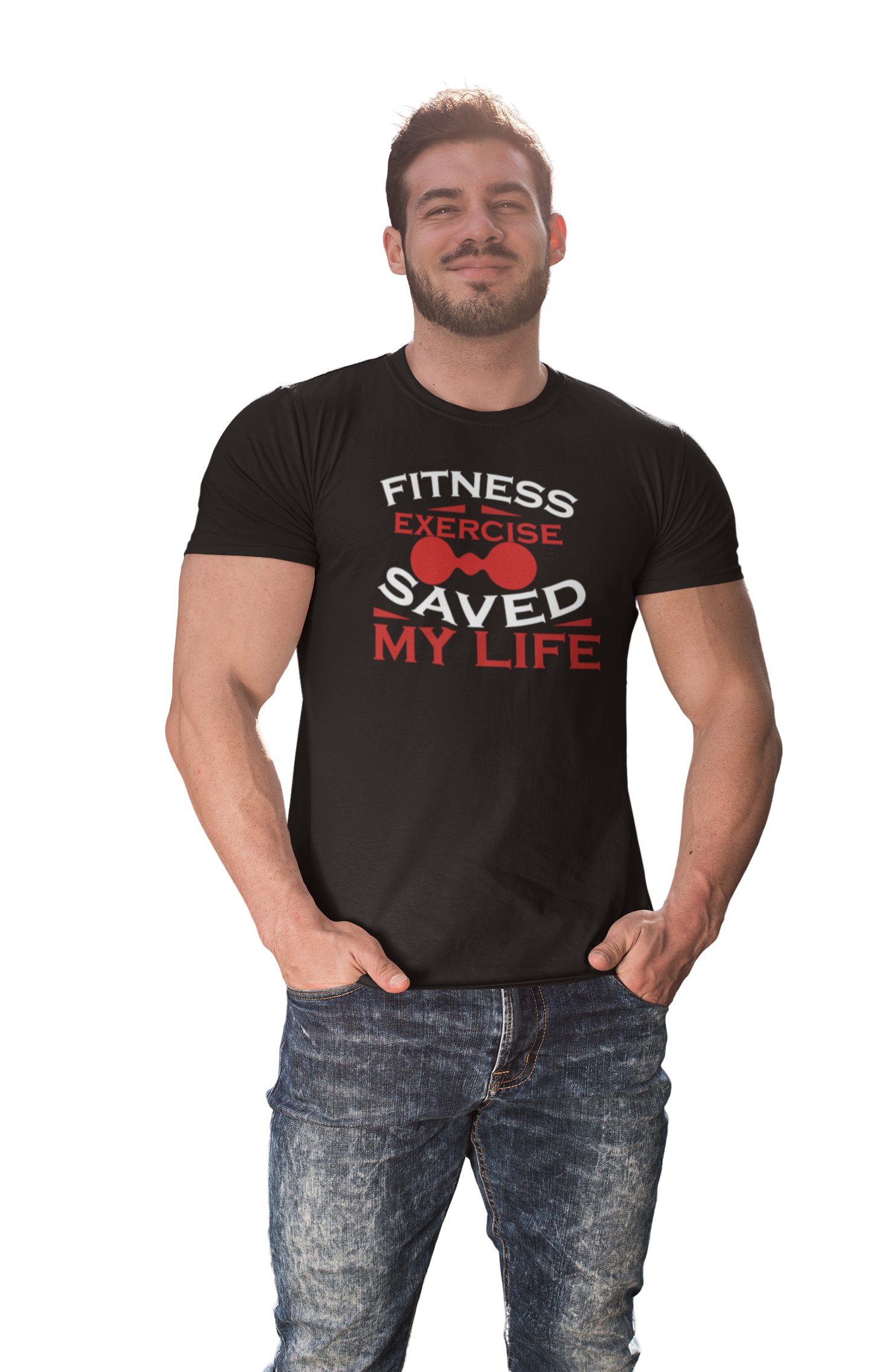 Fitness, Exercise Saved My Life, (BG Red and White), Round Neck Gym Tshirt (White Tshirt) - Clothes for Gym Lovers - Suitable for Gym Going Person - Foremost Gifting Material for Your Friends and Close Ones