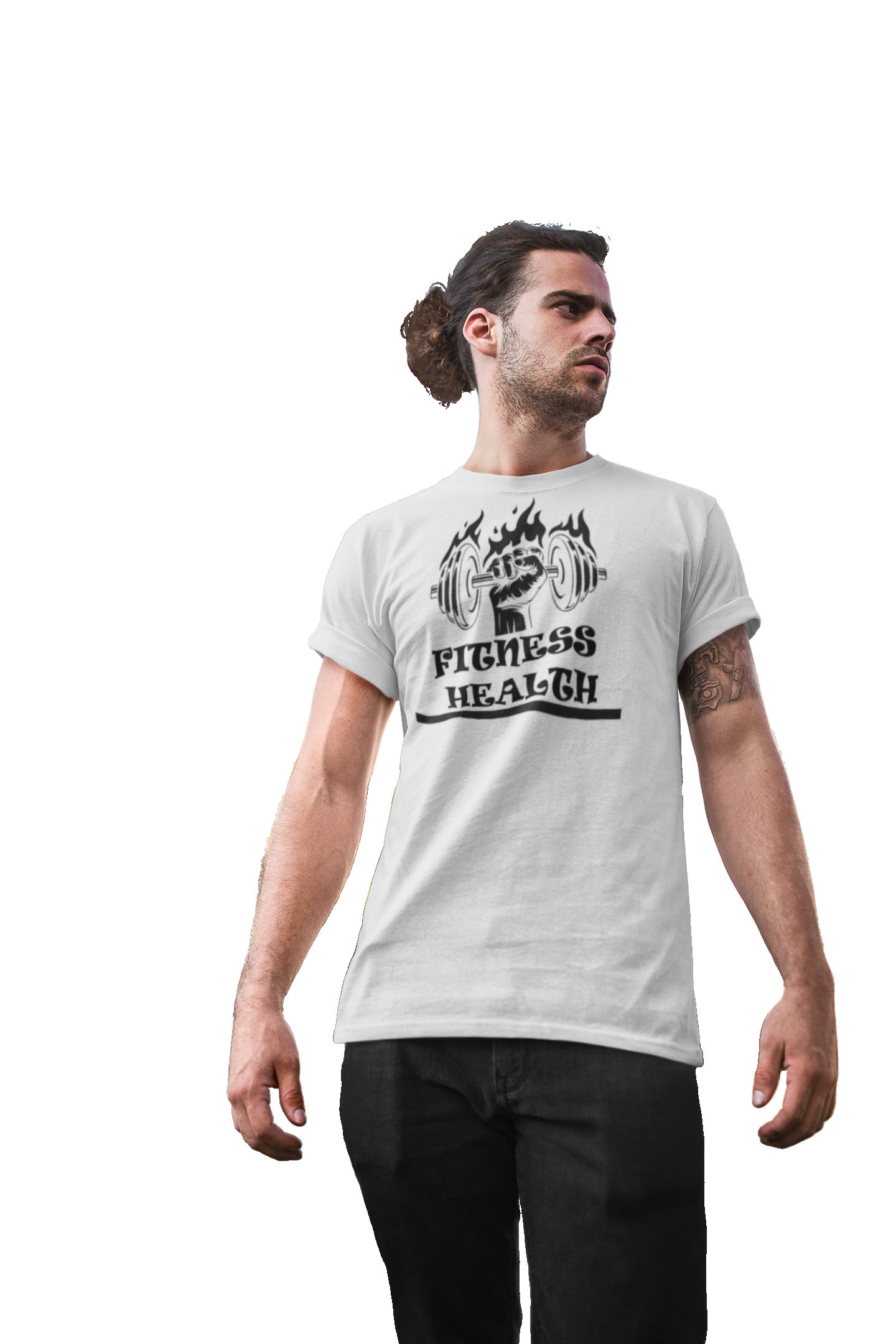 Fitness Health, Fist In Fire (BG Black), Round Neck Gym Tshirt (White Tshirt) - Clothes for Gym Lovers - Suitable for Gym Going Person - Foremost Gifting Material for Your Friends and Close Ones