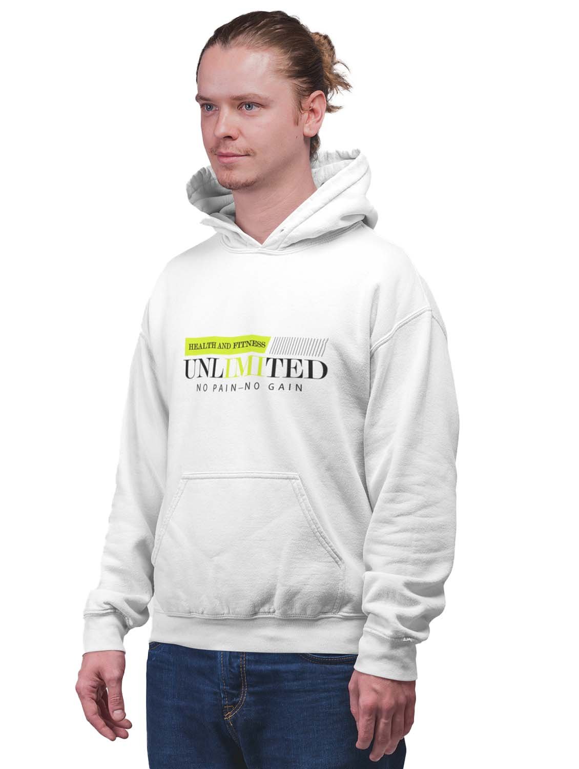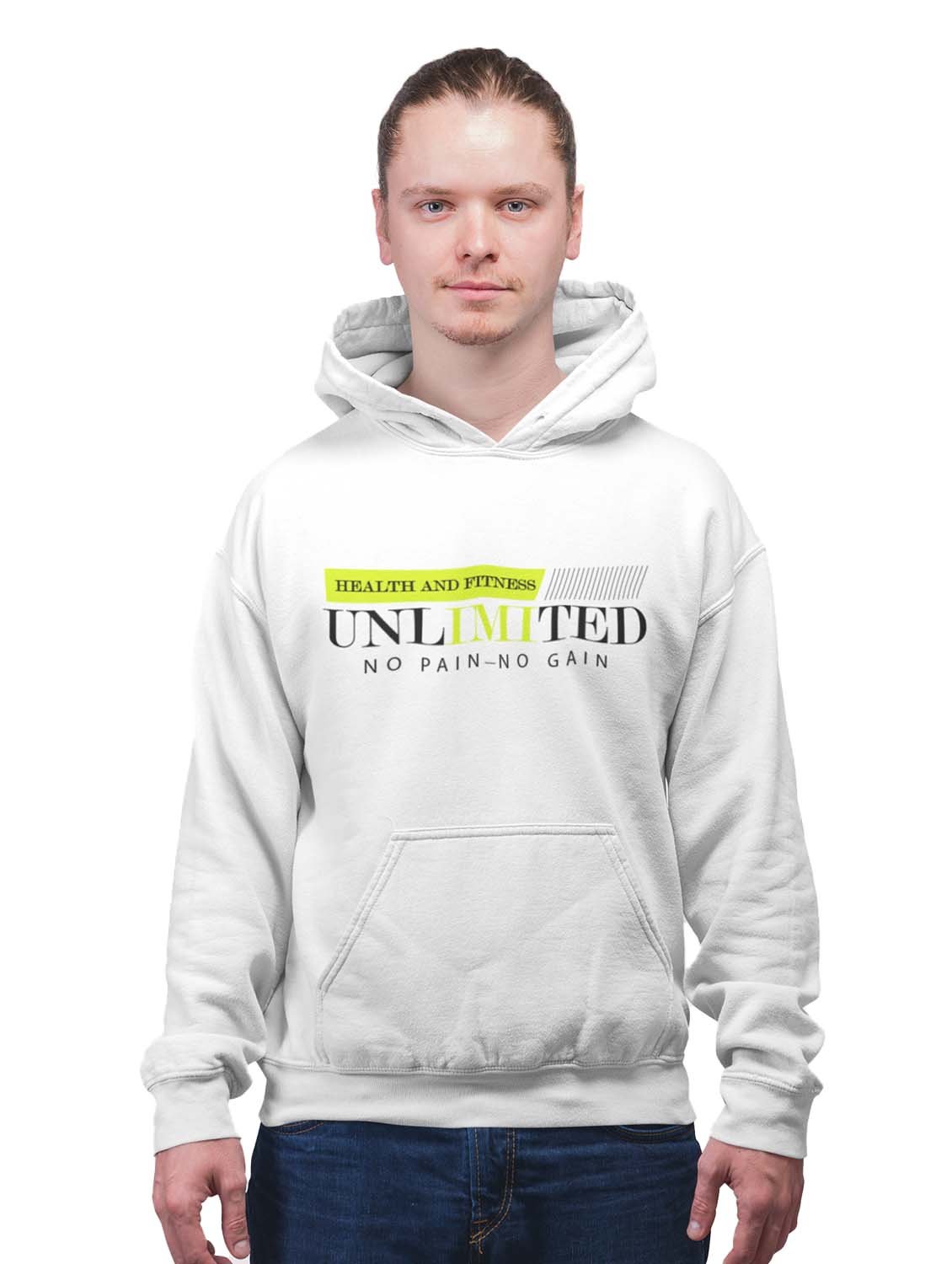 Fitness, Unlimited, No Pain, No Gain, (Green & Black) printed activewear white hoodies for winter casual wear specially for Men