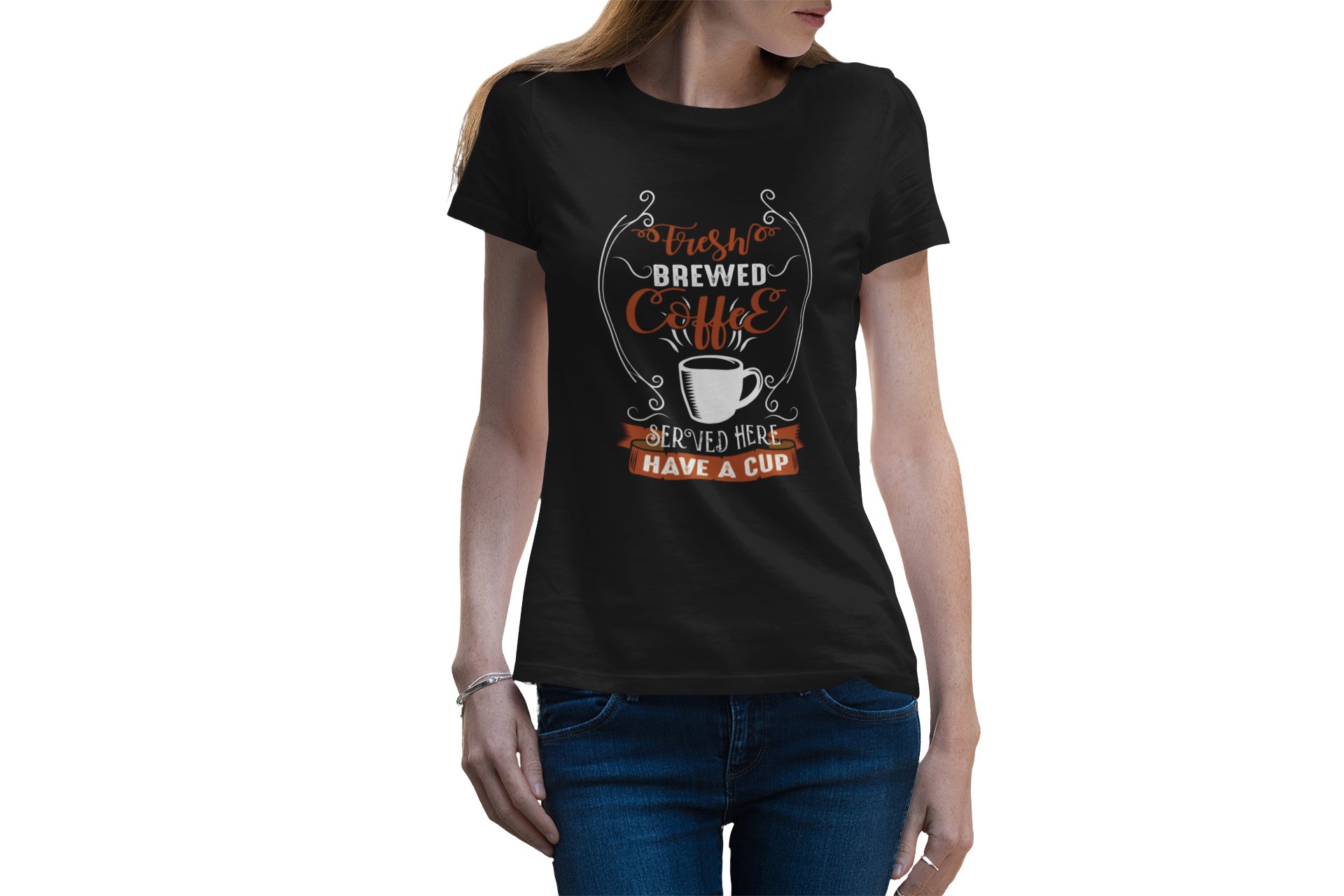 Fresh brewed Coffee served here have acup - Black - printed t shirt - comfortable round neck cotton.