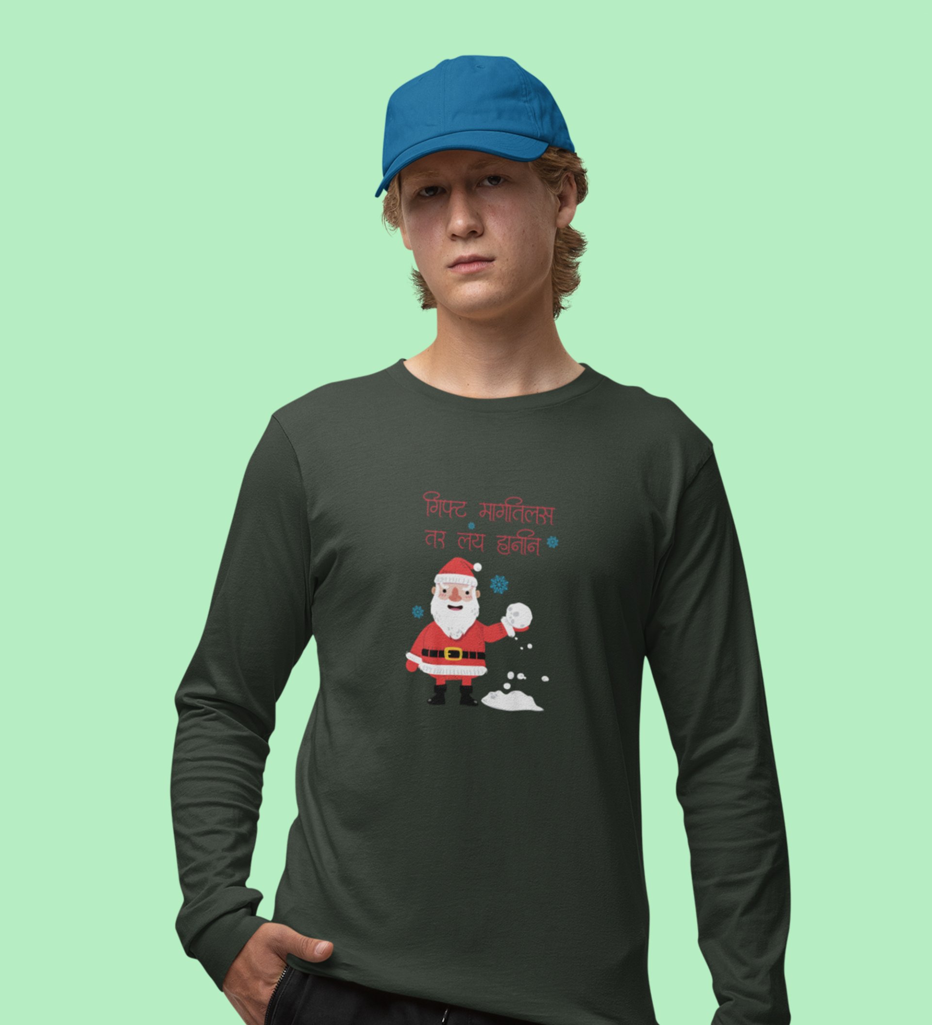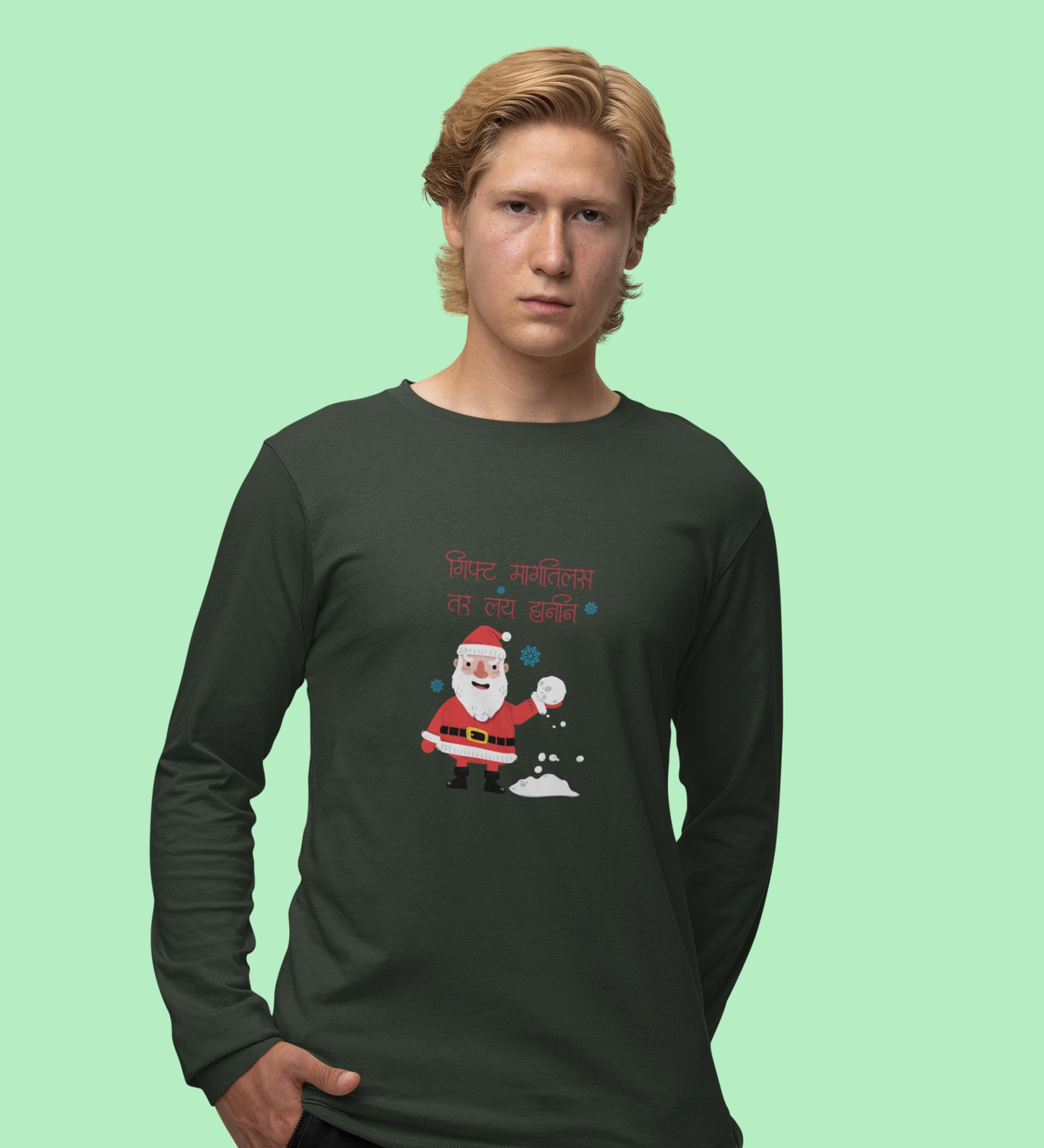 Funny Marathi Santa: Funniest DesignedFull Sleeve T-shirt Ever Green Unique Gift For Secret Santa