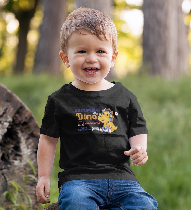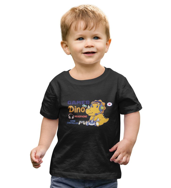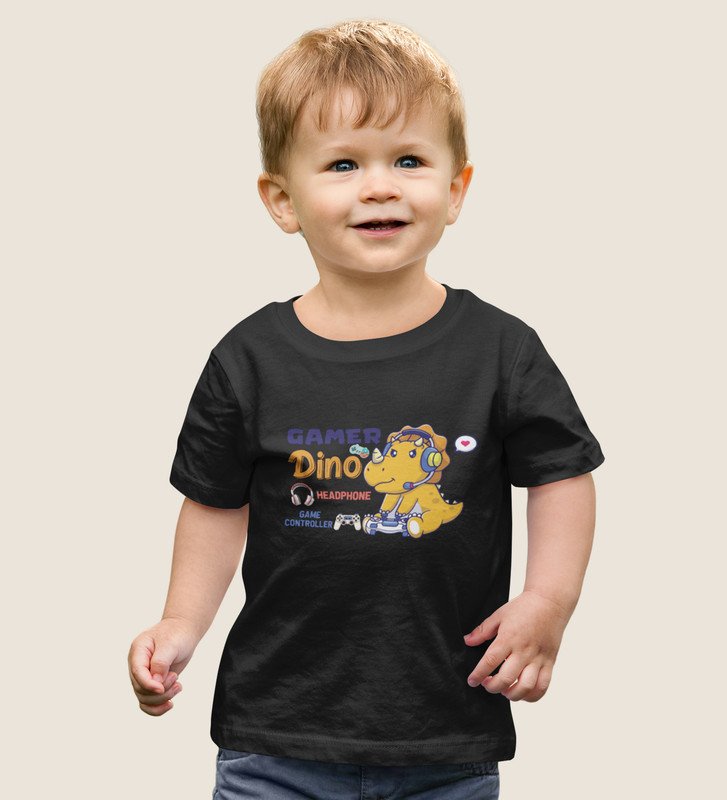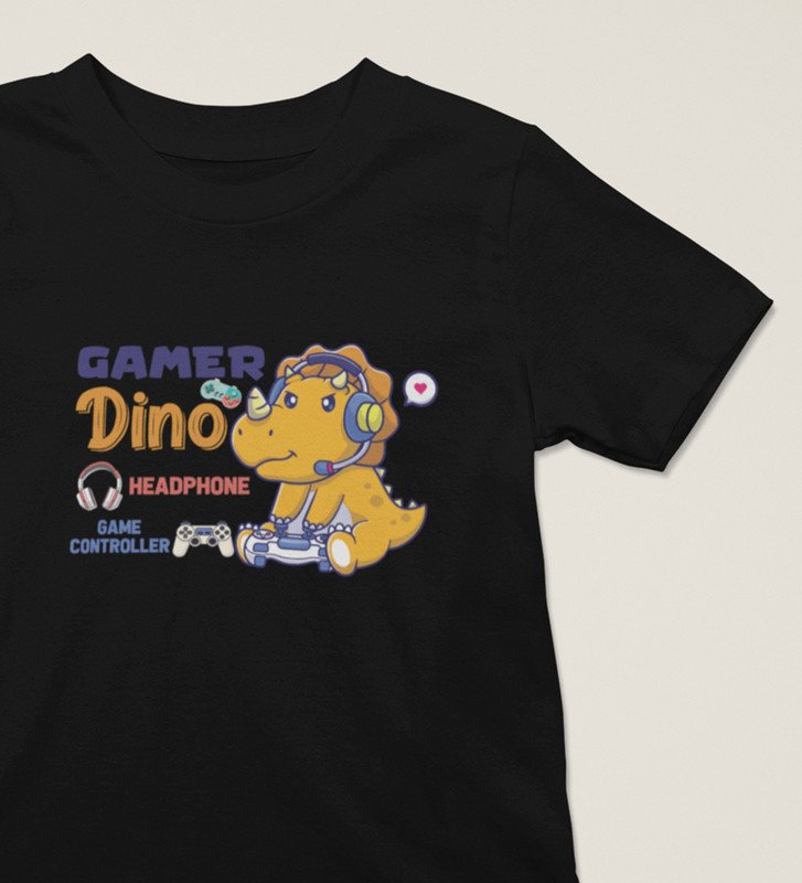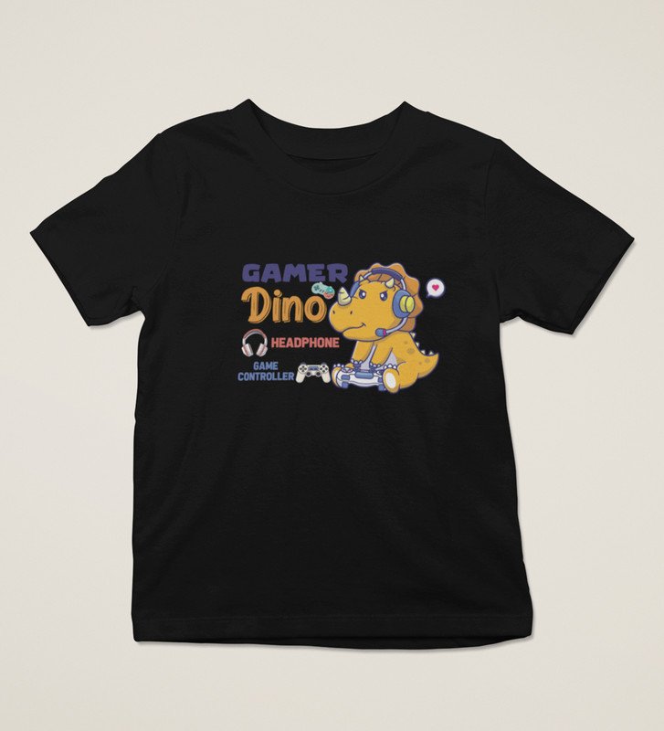 Gamer Dino, Boys Round Neck Blended Cotton Tshirt (black)
