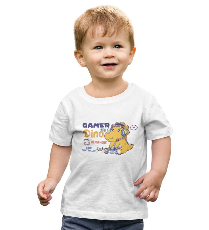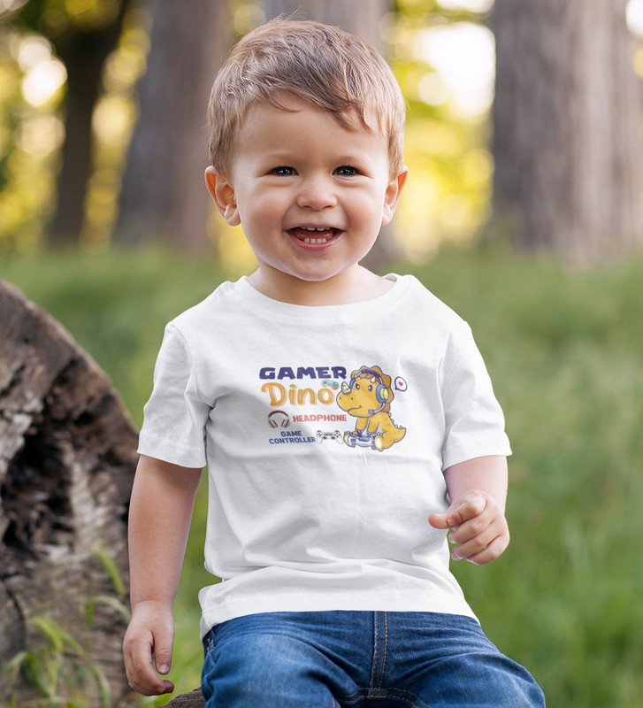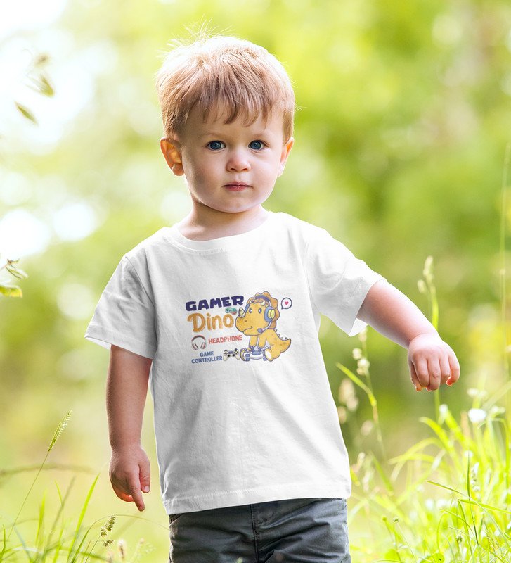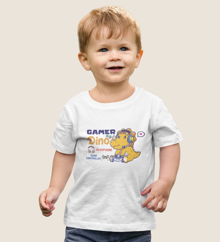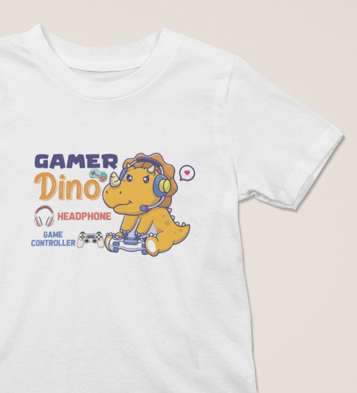 Gamer Dino, Boys Round Neck Blended Cotton Tshirt (White)