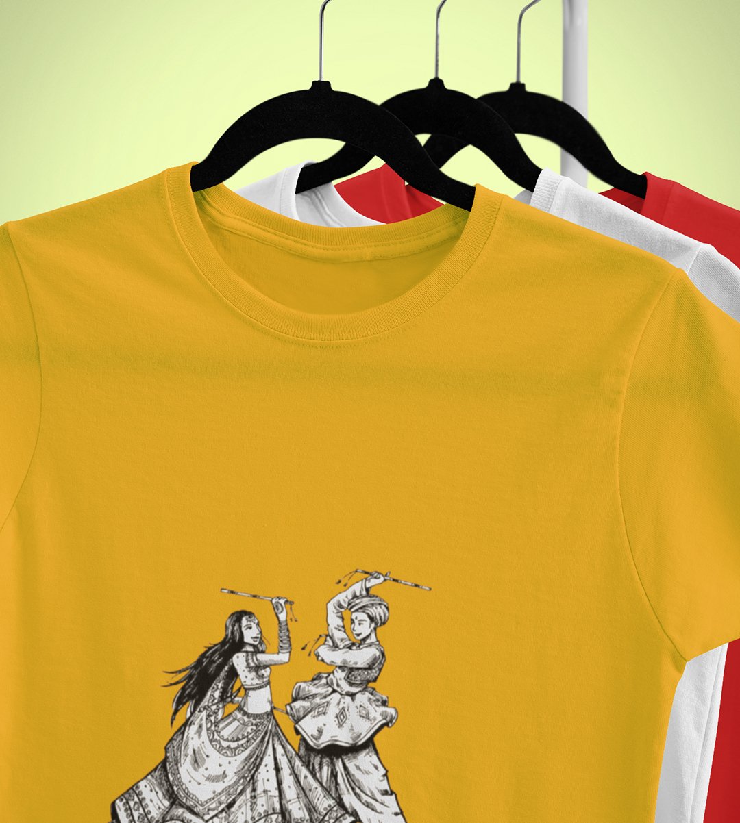 Garba couple potrait printed unisex adults round neck cotton half-sleeve yellow tshirt specially for Navratri festival/ Durga puja