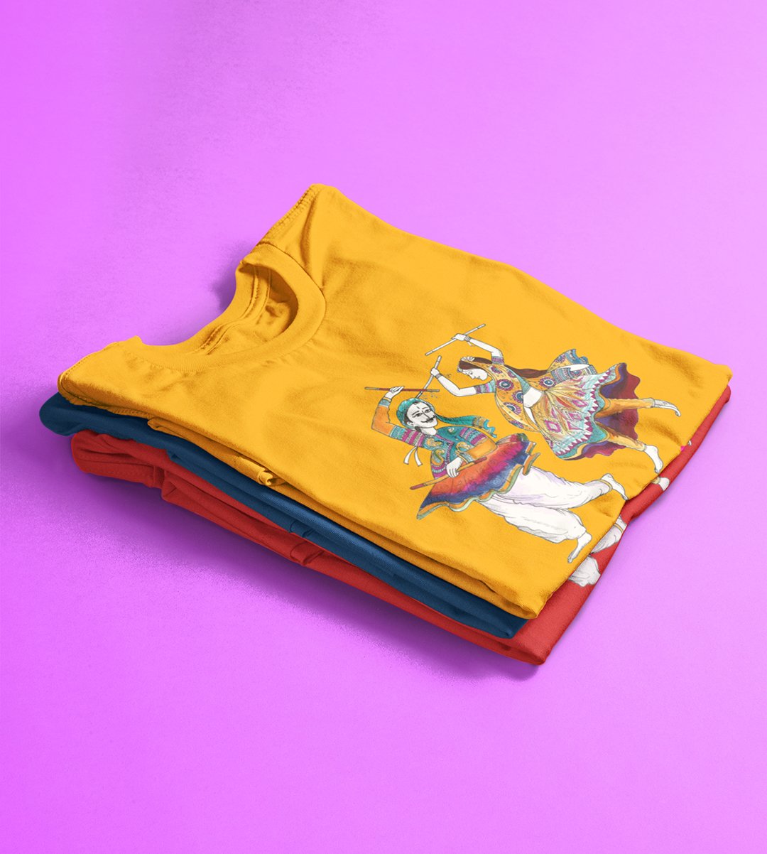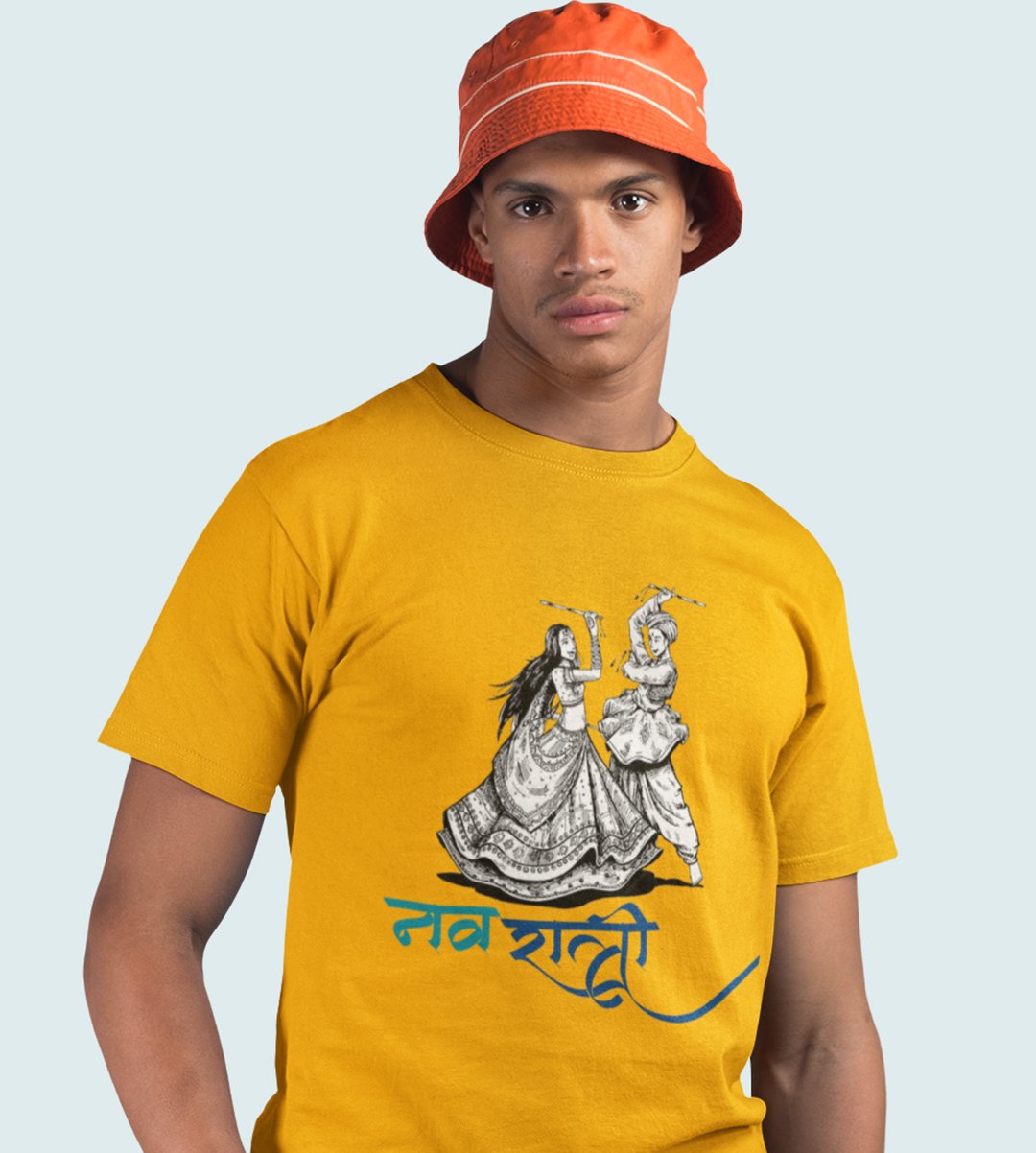 Navratri is a very auspicious festival for hindus. It takes place at the beginning of October and sometimes September. Enjoy the 9 days of festivities with full zeal and make yourself submerged in the love of Maa Durga. Navratri is also known as Durga Puja. And with this Tees, you can shine like a star during this festive season with our navratri themed cotton half sleeved Tshirts. You can pair our t-shirts with trousers and denim of your choice and make it a weekday smart casual or weekend wear. This is durable. This tshirt is smooth and soft which makes you comfortable to wear during all seasons. The printing in it is durable and odourless. It has five sizes, S,M,L,XL,XXL. The Tshirt colour is intact even after repeated washes. It can be kept in your wardrobe and hangers. Please avoid washing mashine to clean this Tee, it may affect the print. Hand wash only. We have brought you many navratri related designs printed on our different colour Tshirts to choose from. Grab it now.