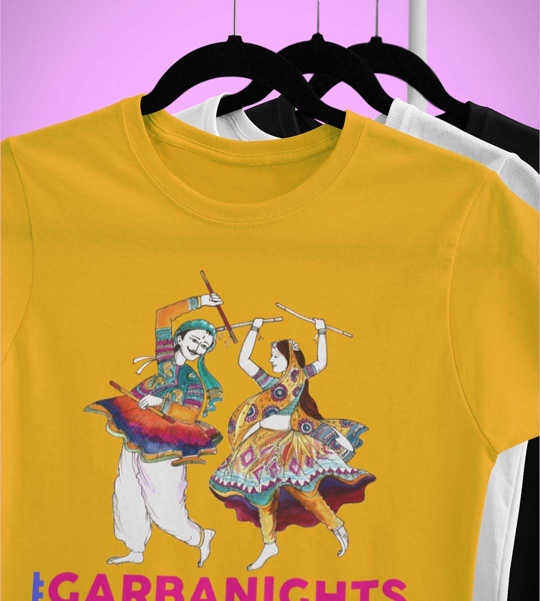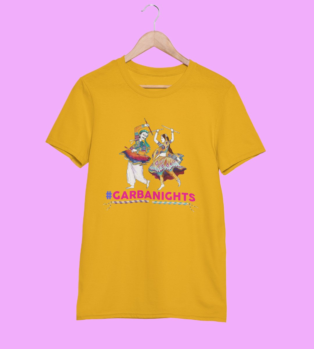 Garba nights, couple printed unisex adults round neck cotton half-sleeve yellow tshirt specially for Navratri festival/ Durga puja