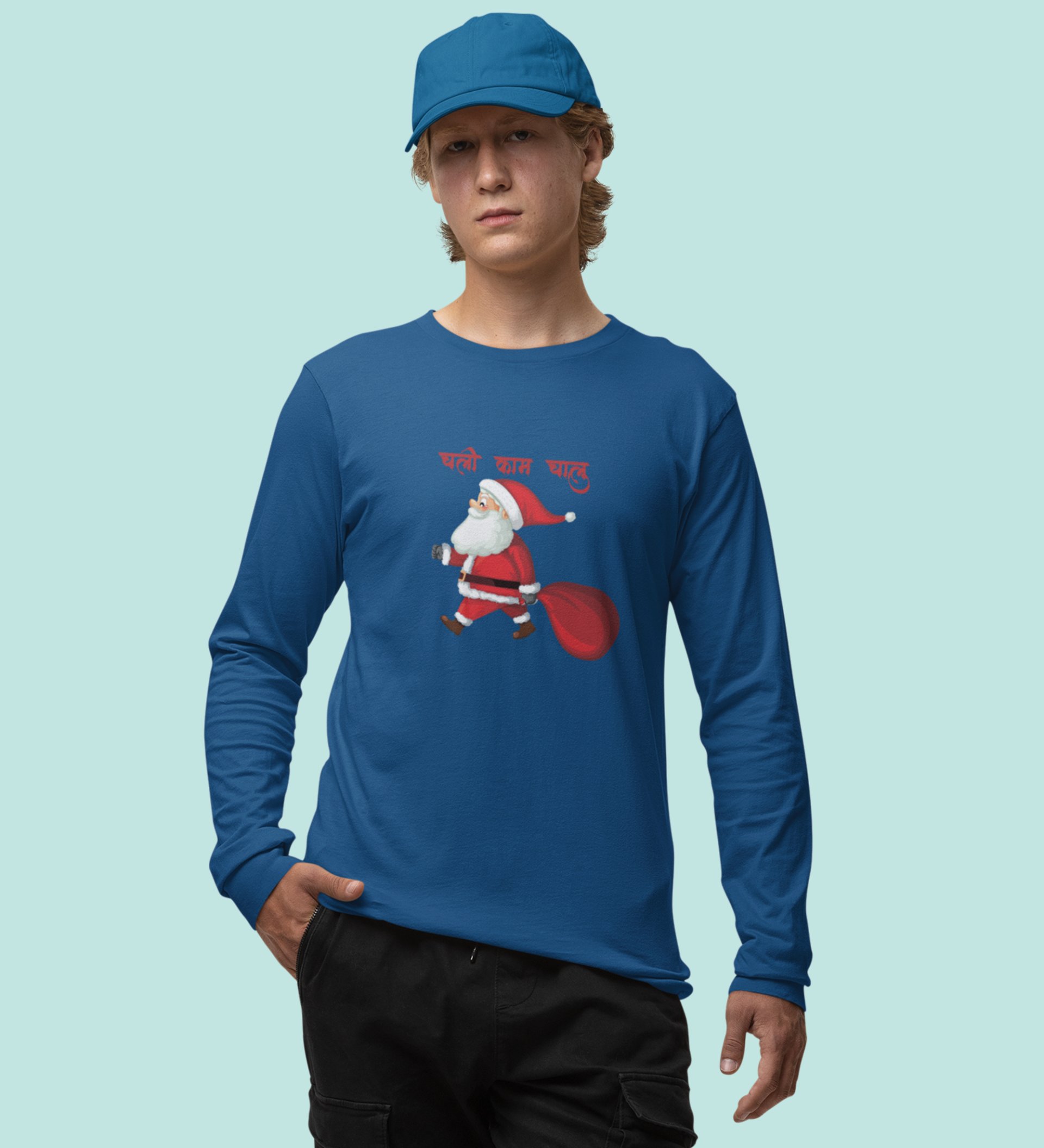 Get Back To Work Santa : Hydrate Festively withBlueFull Sleeve T-shirt - Leak-Proof, Marathi Printed Design