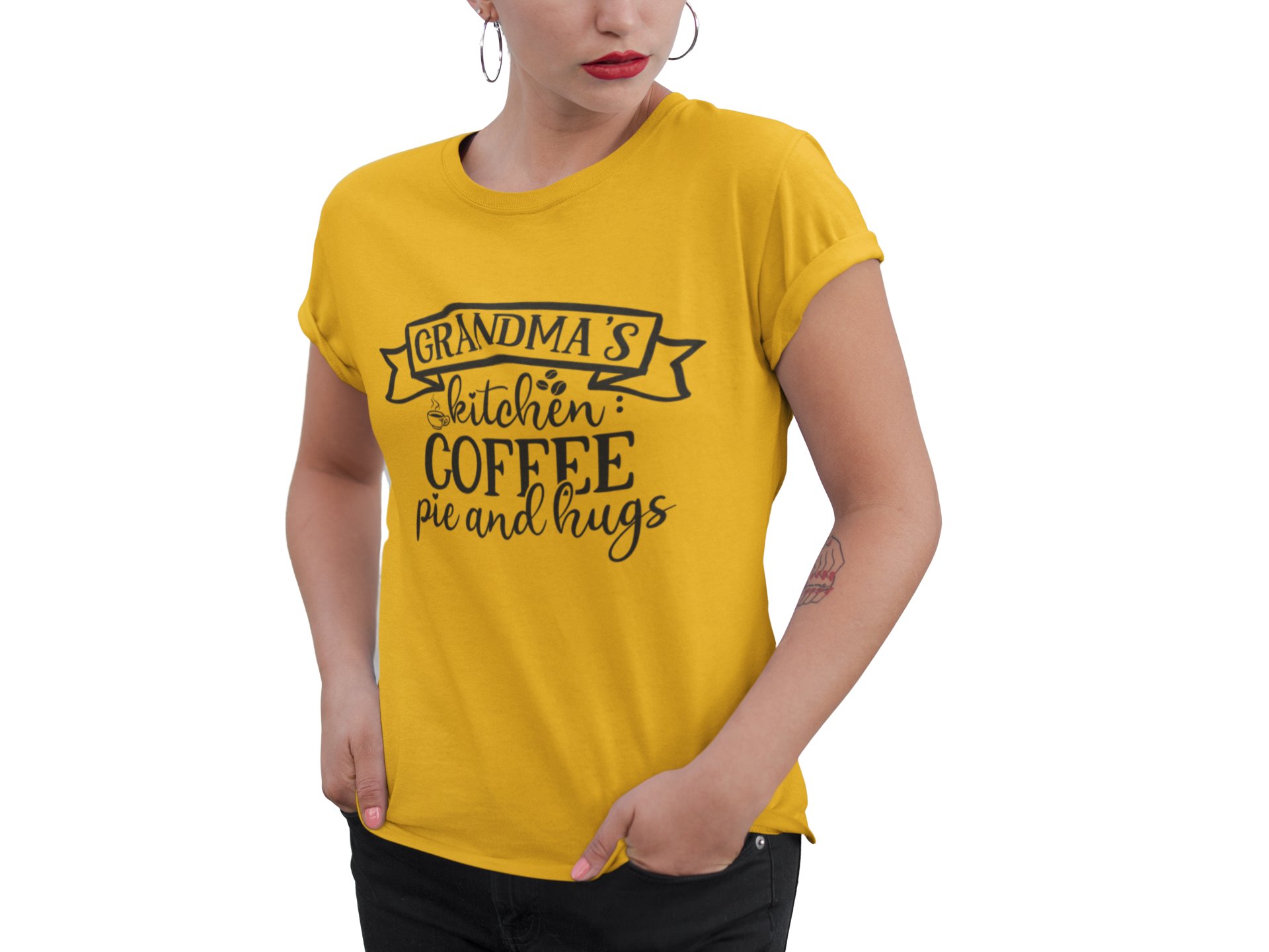 Grandma's kitchen Coffee pie and hugs - Yellow - printed t shirt - comfortable round neck cotton.