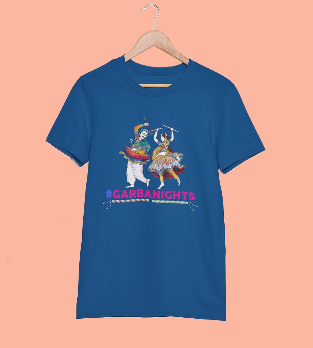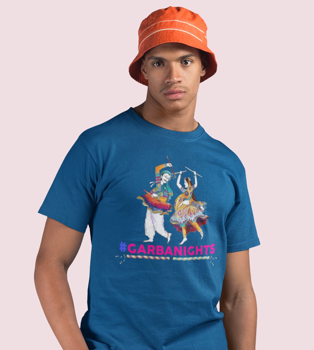 Gujarati couple (garba dance) printed unisex adults round neck cotton half-sleeve blue tshirt specially for Navratri festival/ Durga puja
