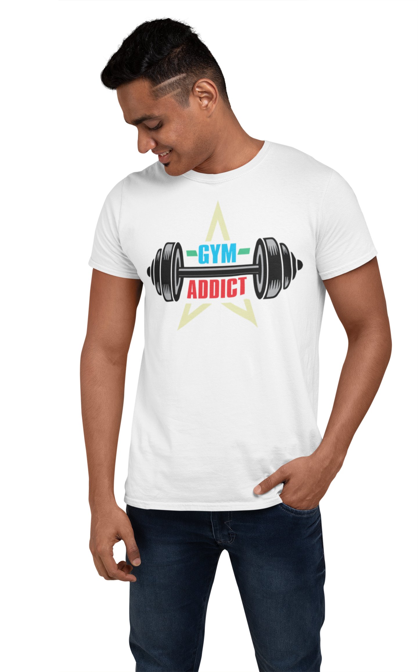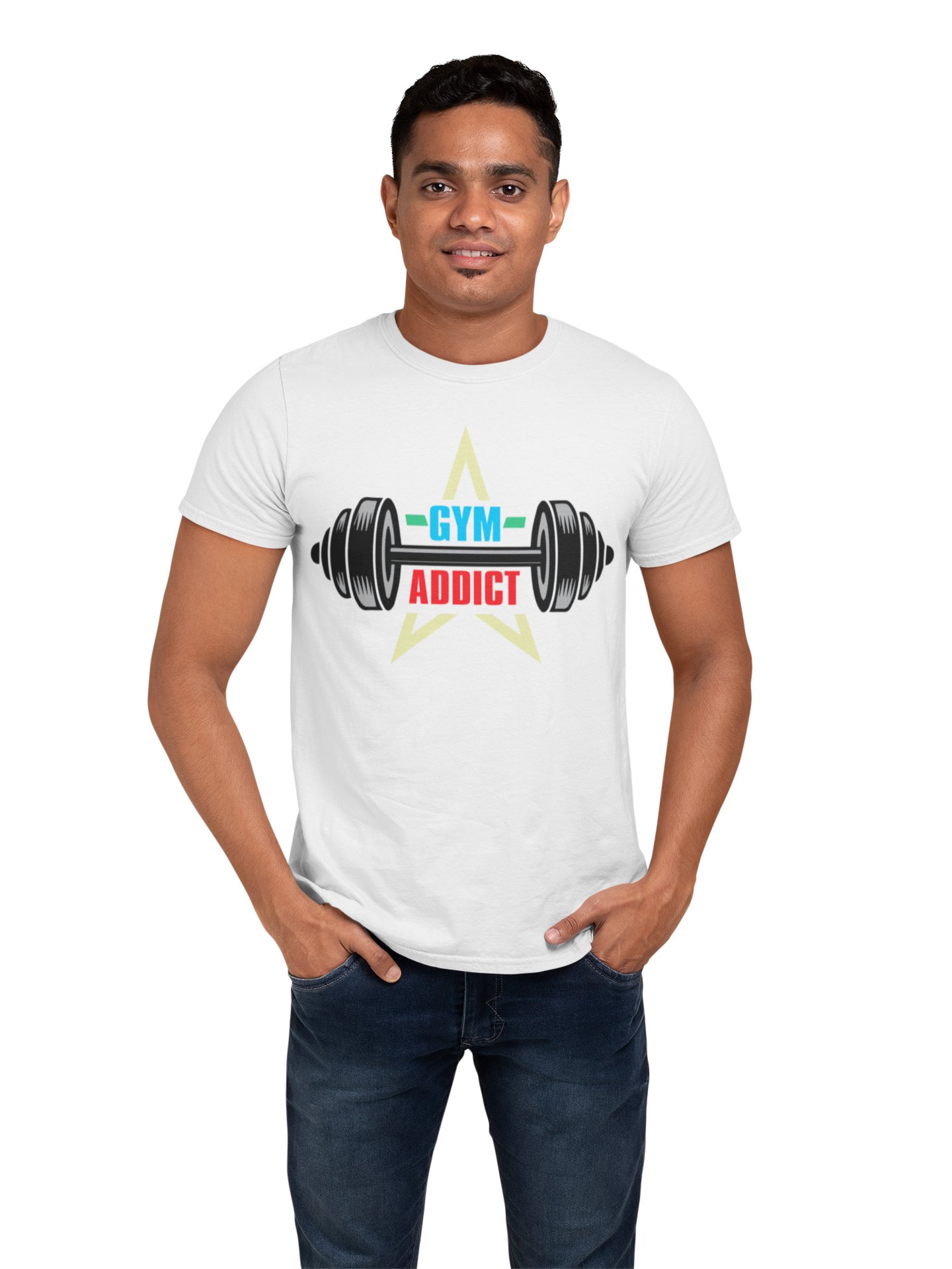 Gym Addict, (BG White, Red and Yellow), Barbell In Middle, Round Neck Gym Tshirt (White Tshirt) - Clothes for Gym Lovers - Suitable for Gym Going Person - Foremost Gifting Material for Your Friends and Close Ones