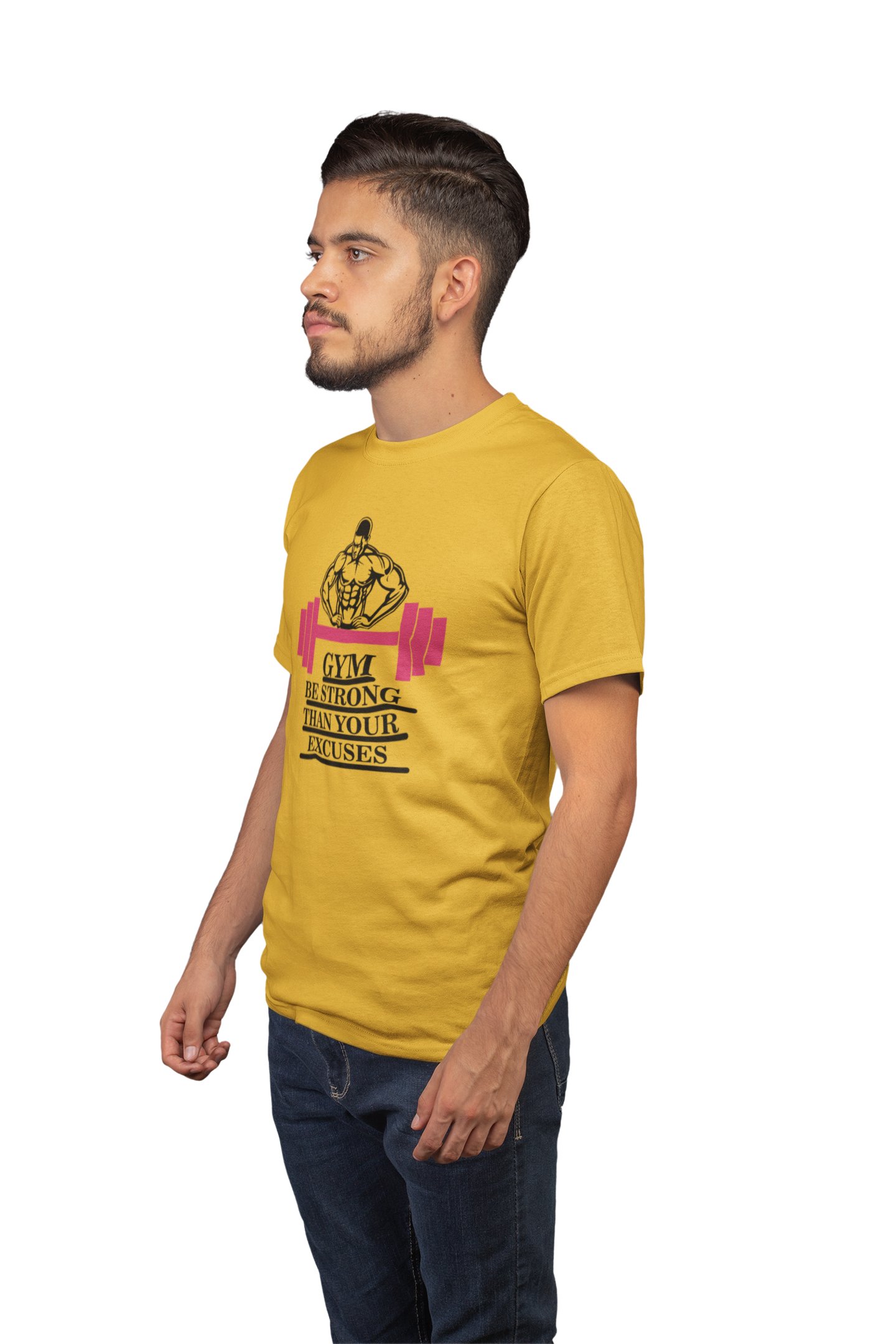 Gym, Be Strong Than Your Excuses, Round Neck Gym Tshirt (Yellow Tshirt) - Clothes for Gym Lovers - Foremost Gifting Material for Your Friends and Close Ones