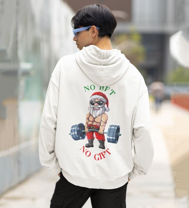 Gym Lover Santa Saying No Lift, No Gift Get Ready to Lift This Holiday Season Printed White Cotton Hoodie