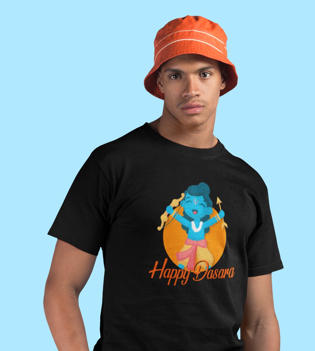 Happy Dasara printed unisex adults round neck cotton half-sleeve black tshirt specially for Navratri festival/ Durga puja