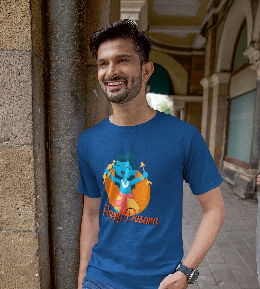 Happy Dasara printed unisex adults round neck cotton half-sleeve blue tshirt specially for Navratri festival/ Durga puja