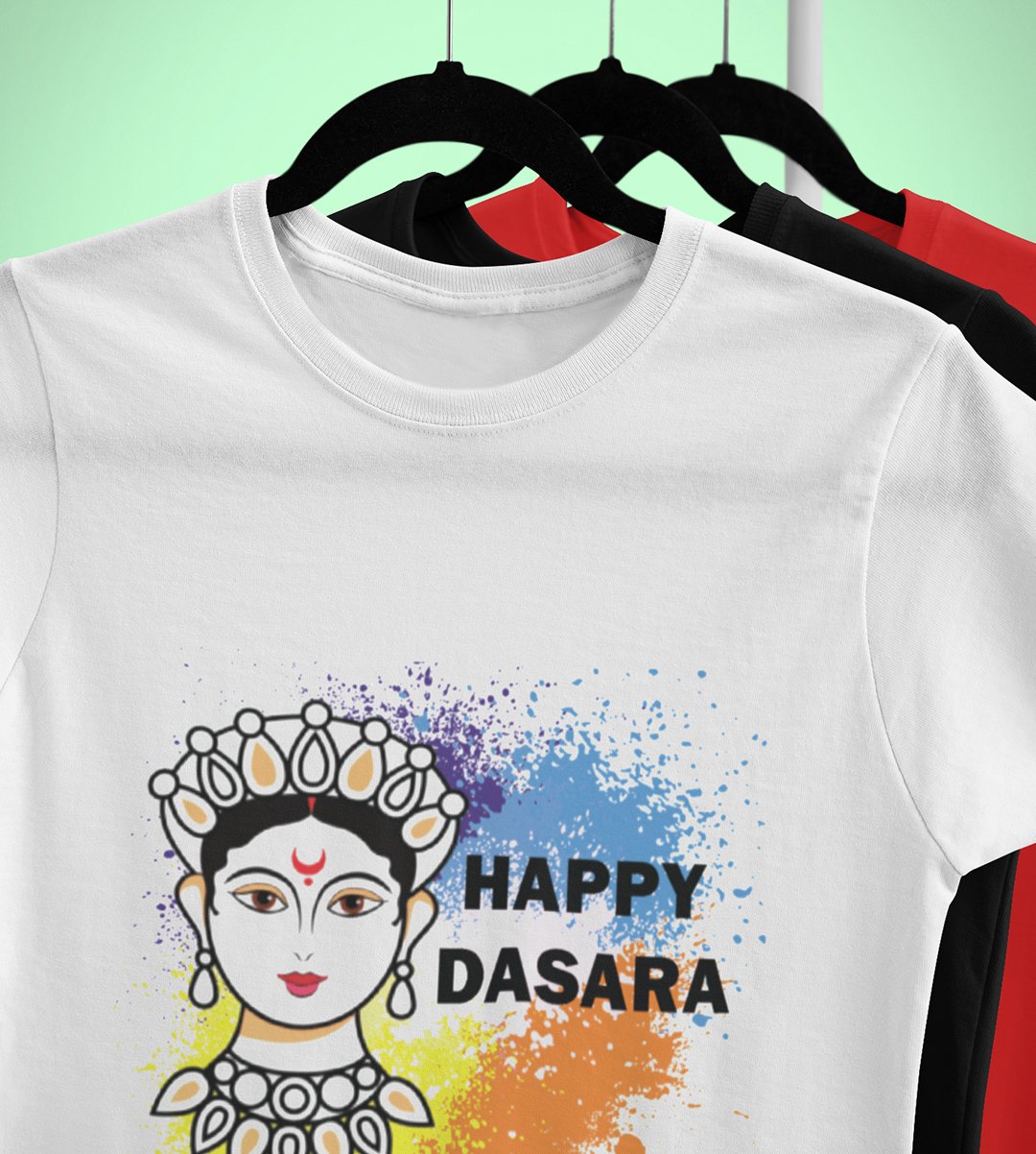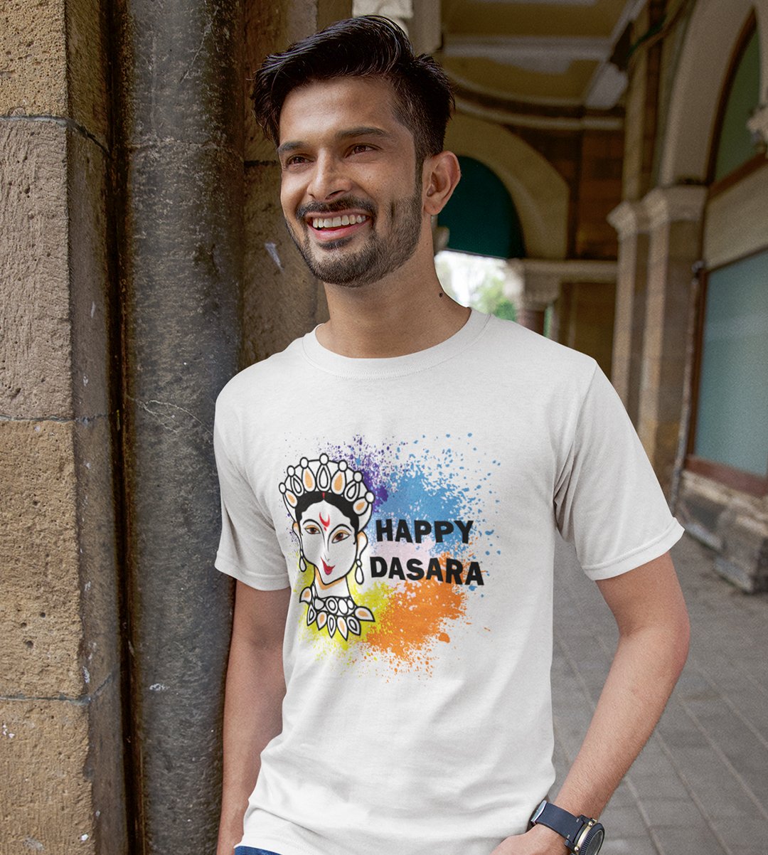 Happy Dasara (white) printed unisex adults round neck cotton half-sleeve white tshirt specially for Navratri festival/ Durga puja