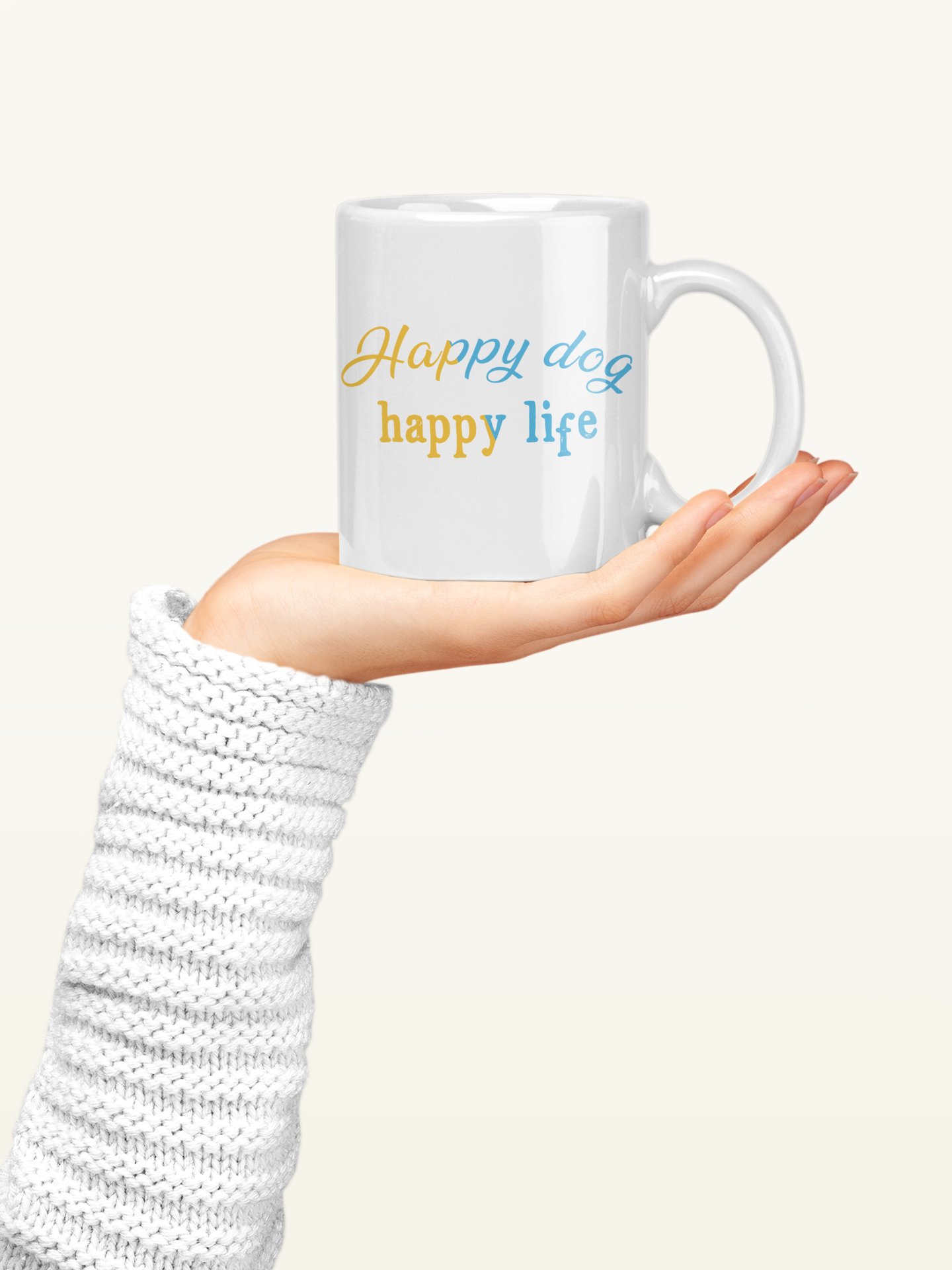 Happy dog happy life yellow and blue text - pets themed printed ceramic white coffee and tea mugs/ cups for pets lover people