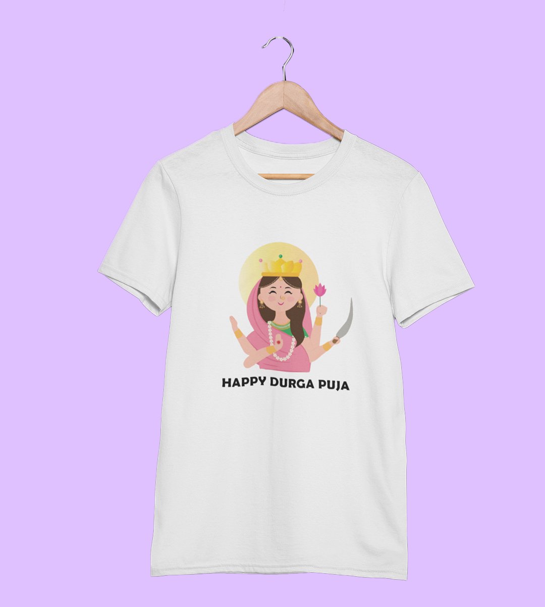 Happy durga puja (pink saree) printed unisex adults round neck cotton half-sleeve white tshirt specially for Navratri festival/ Durga puja