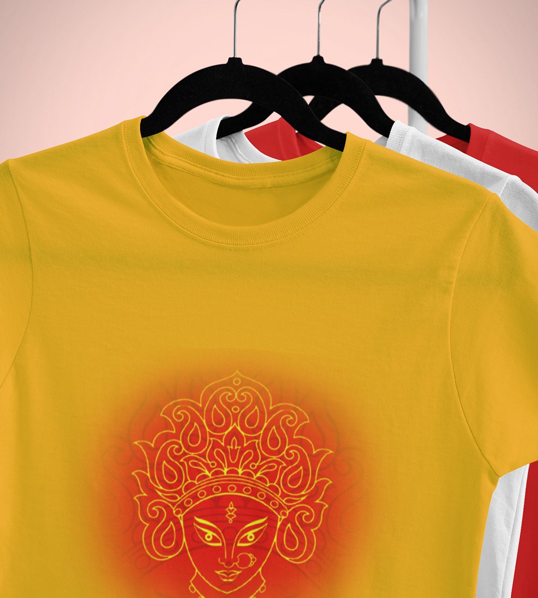 Navratri is a very auspicious festival for hindus. It takes place at the beginning of October and sometimes September. Enjoy the 9 days of festivities with full zeal and make yourself submerged in the love of Maa Durga. Navratri is also known as Durga Puja. And with this Tees, you can shine like a star during this festive season with our navratri themed cotton half sleeved Tshirts. You can pair our t-shirts with trousers and denim of your choice and make it a weekday smart casual or weekend wear. This is durable. This tshirt is smooth and soft which makes you comfortable to wear during all seasons. The printing in it is durable and odourless. It has five sizes, S,M,L,XL,XXL. The Tshirt colour is intact even after repeated washes. It can be kept in your wardrobe and hangers. Please avoid washing mashine to clean this Tee, it may affect the print. Hand wash only. We have brought you many navratri related designs printed on our different colour Tshirts to choose from. Grab it now.