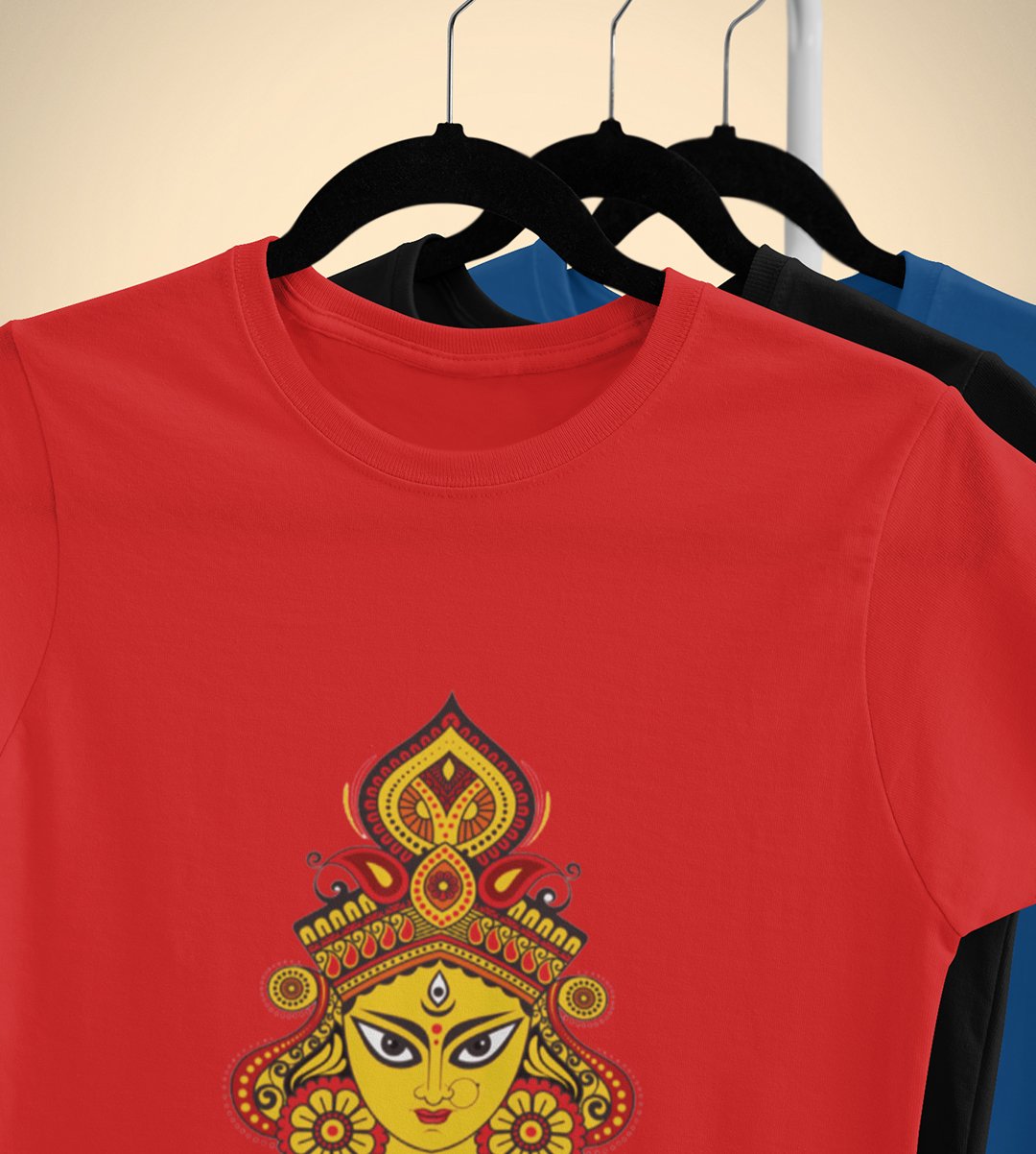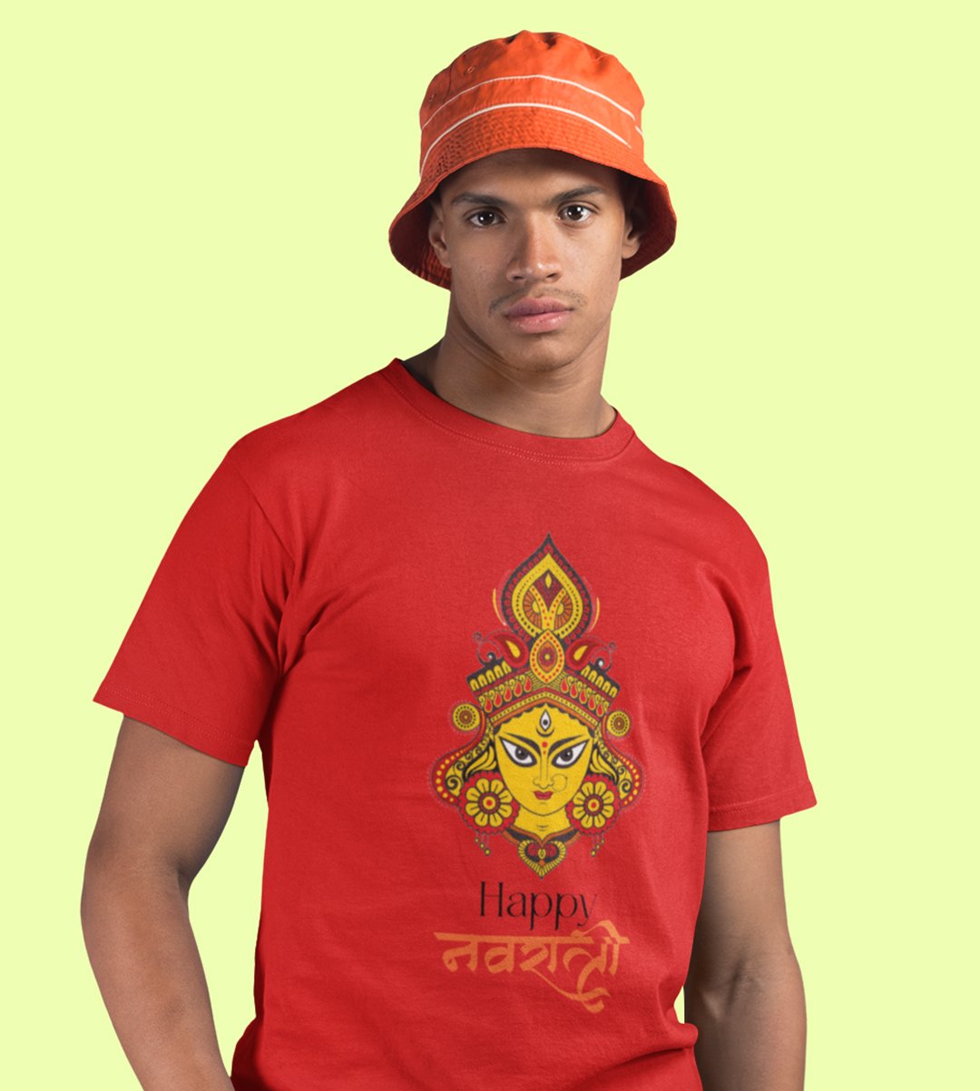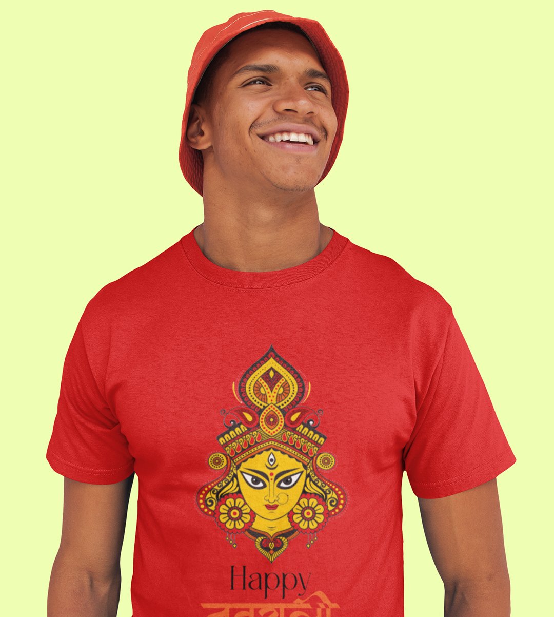 Navratri is a very auspicious festival for hindus. It takes place at the beginning of October and sometimes September. Enjoy the 9 days of festivities with full zeal and make yourself submerged in the love of Maa Durga. Navratri is also known as Durga Puja. And with this Tees, you can shine like a star during this festive season with our navratri themed cotton half sleeved Tshirts. You can pair our t-shirts with trousers and denim of your choice and make it a weekday smart casual or weekend wear. This is durable. This tshirt is smooth and soft which makes you comfortable to wear during all seasons. The printing in it is durable and odourless. It has five sizes, S,M,L,XL,XXL. The Tshirt colour is intact even after repeated washes. It can be kept in your wardrobe and hangers. Please avoid washing mashine to clean this Tee, it may affect the print. Hand wash only. We have brought you many navratri related designs printed on our different colour Tshirts to choose from. Grab it now.