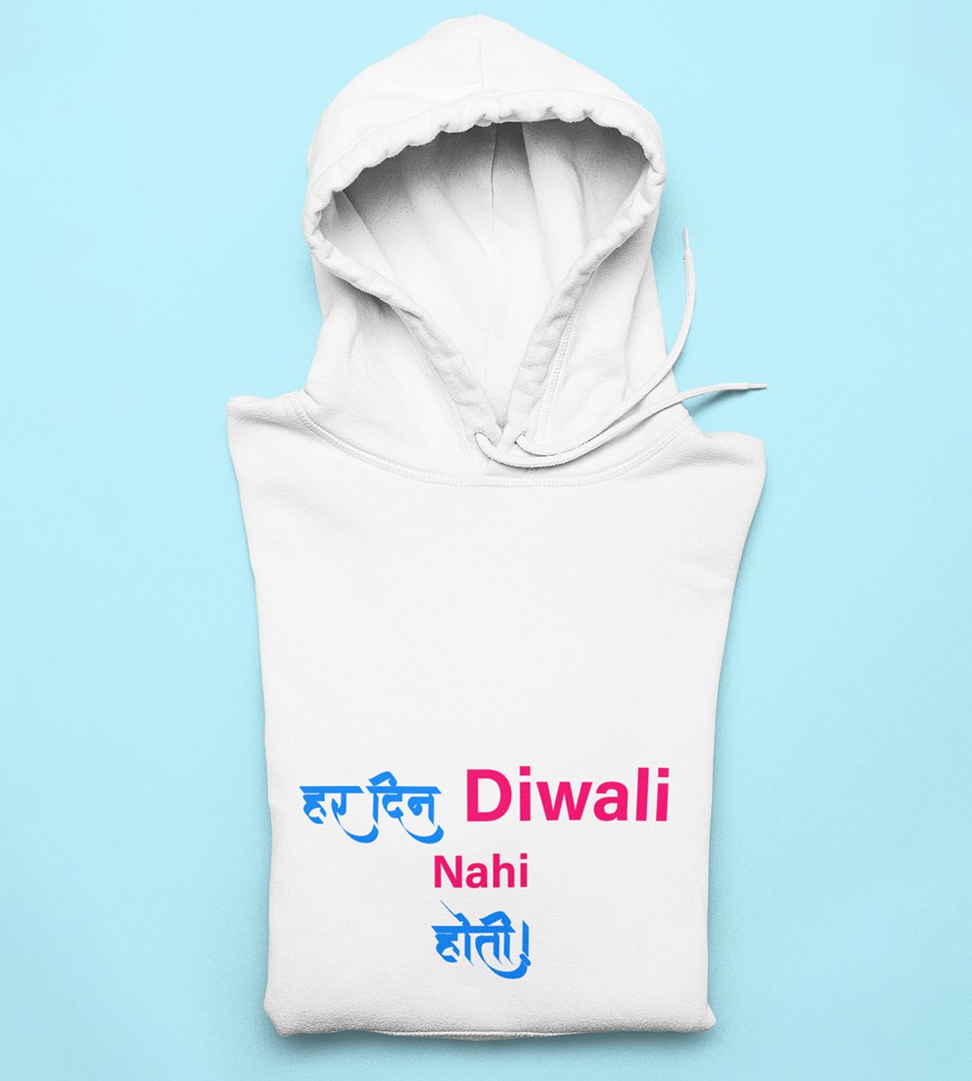 Celebrate the magic of everyday life with our "Everyday Diwali" White Hoodie . The Hinglish message "Har Din Diwali Nai Hoti" reminds us that each day is not Diwali, but there's a Diwali moment in every day. Sip your and embrace the joy of life's little celebrations.