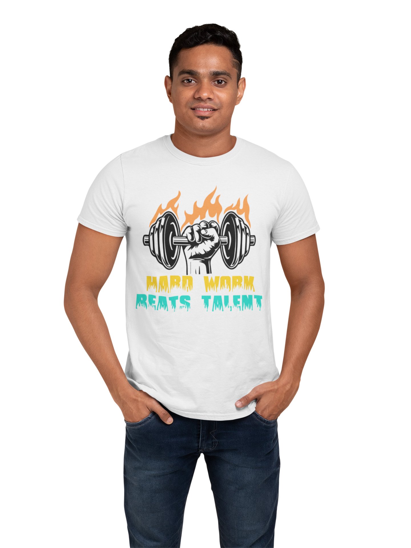 Hard Work Beats Talent, (BG Black, Yellow and White), Round Neck Gym Tshirt (White Tshirt) - Clothes for Gym Lovers - Suitable for Gym Going Person - Foremost Gifting Material for Your Friends