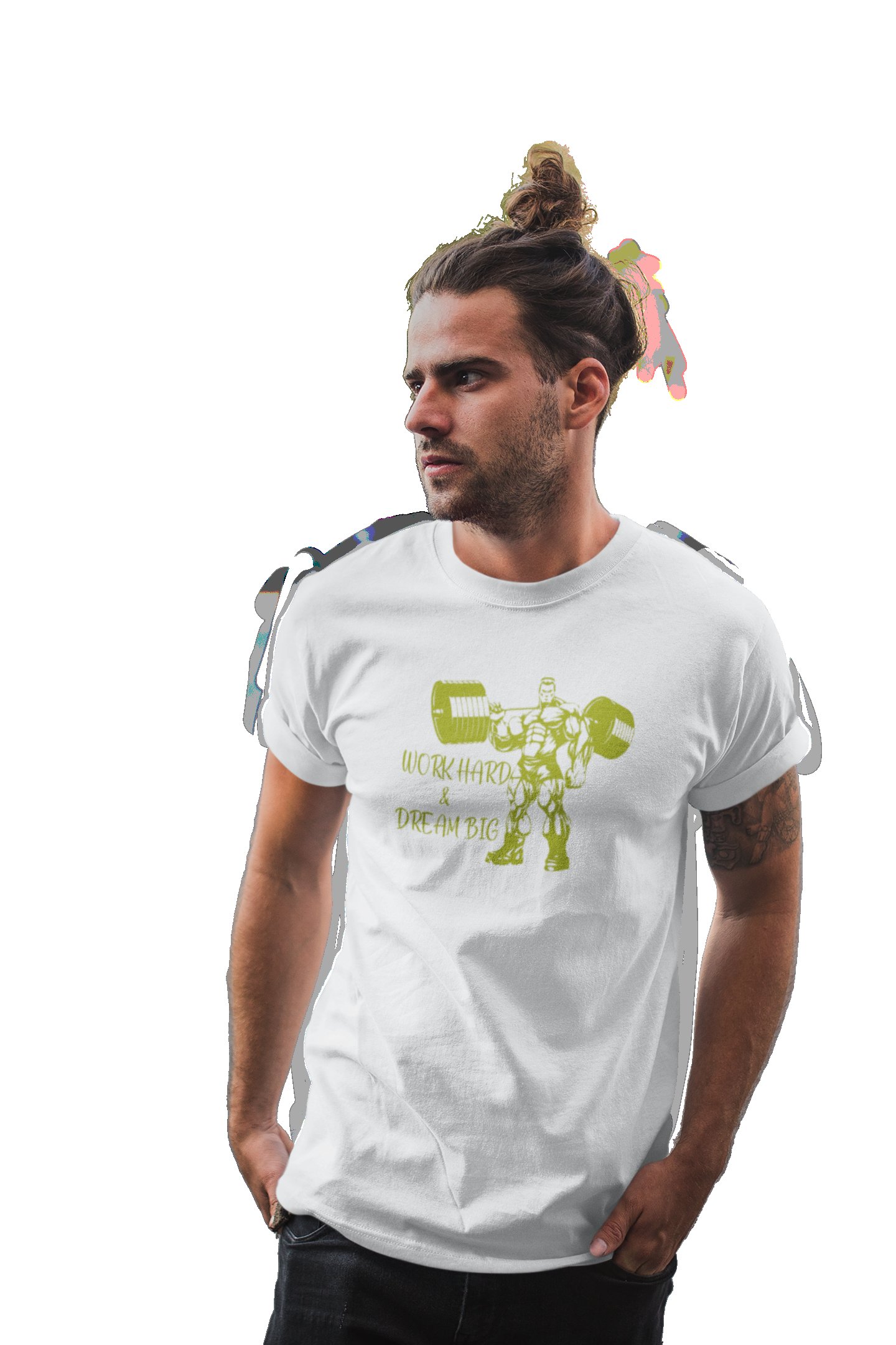 Hard Work & Dream Big (BG Green), Round Neck Gym Tshirt (White Tshirt) - Clothes for Gym Lovers - Suitable for Gym Going Person - Foremost Gifting Material for Your Friends and Close Ones
