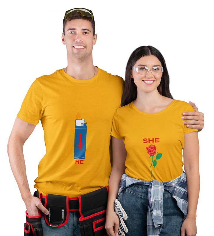 He Is Fire/She Is Rose Printed (Yellow) T-shirts For Couple