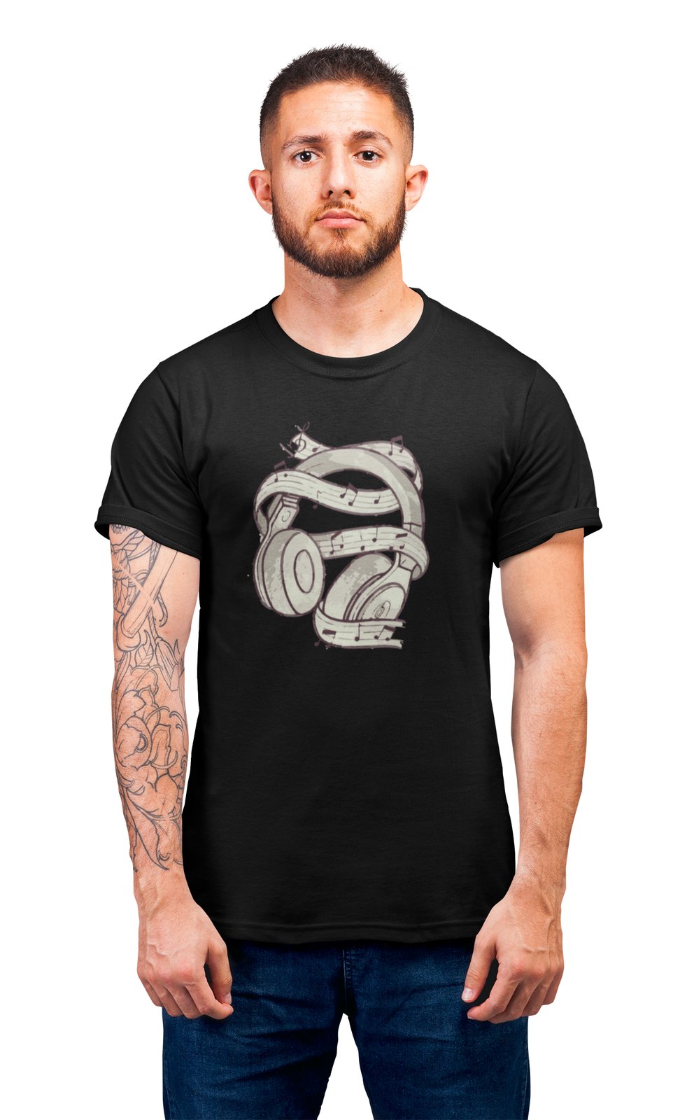 Headphones And music Notes-Black- Men's - printed T-shirt - comfortable round neck Cotton