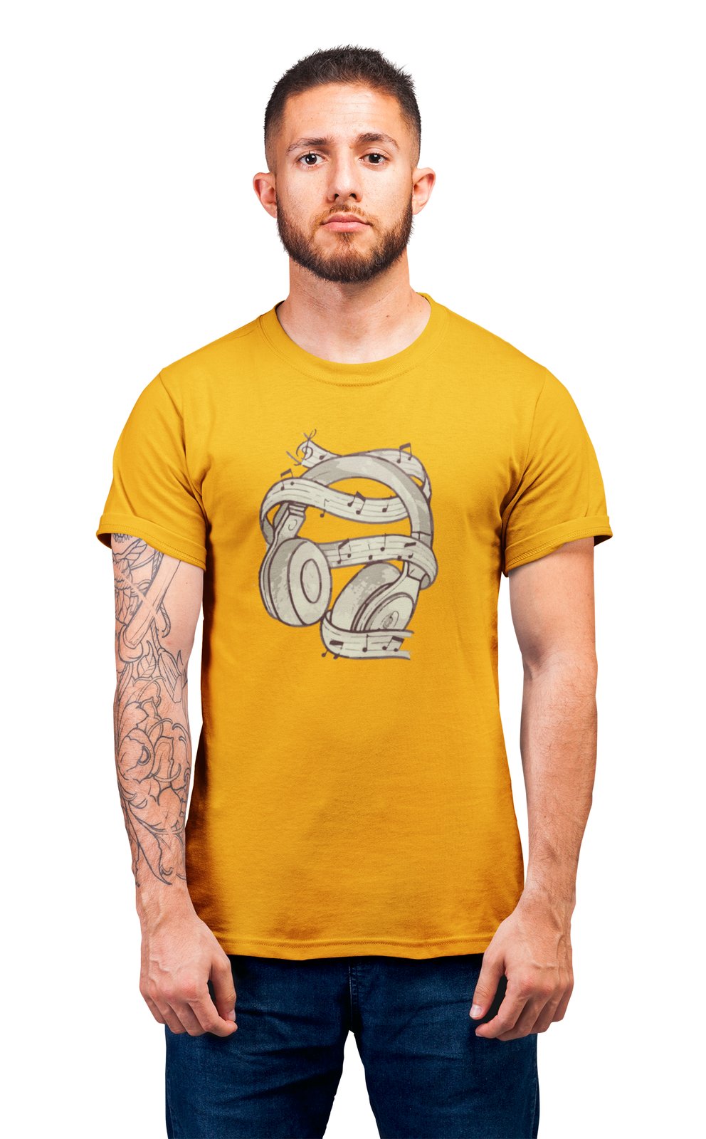 Headphones And music Notes-Yellow - Men's - printed T-shirt - comfortable round neck Cotton