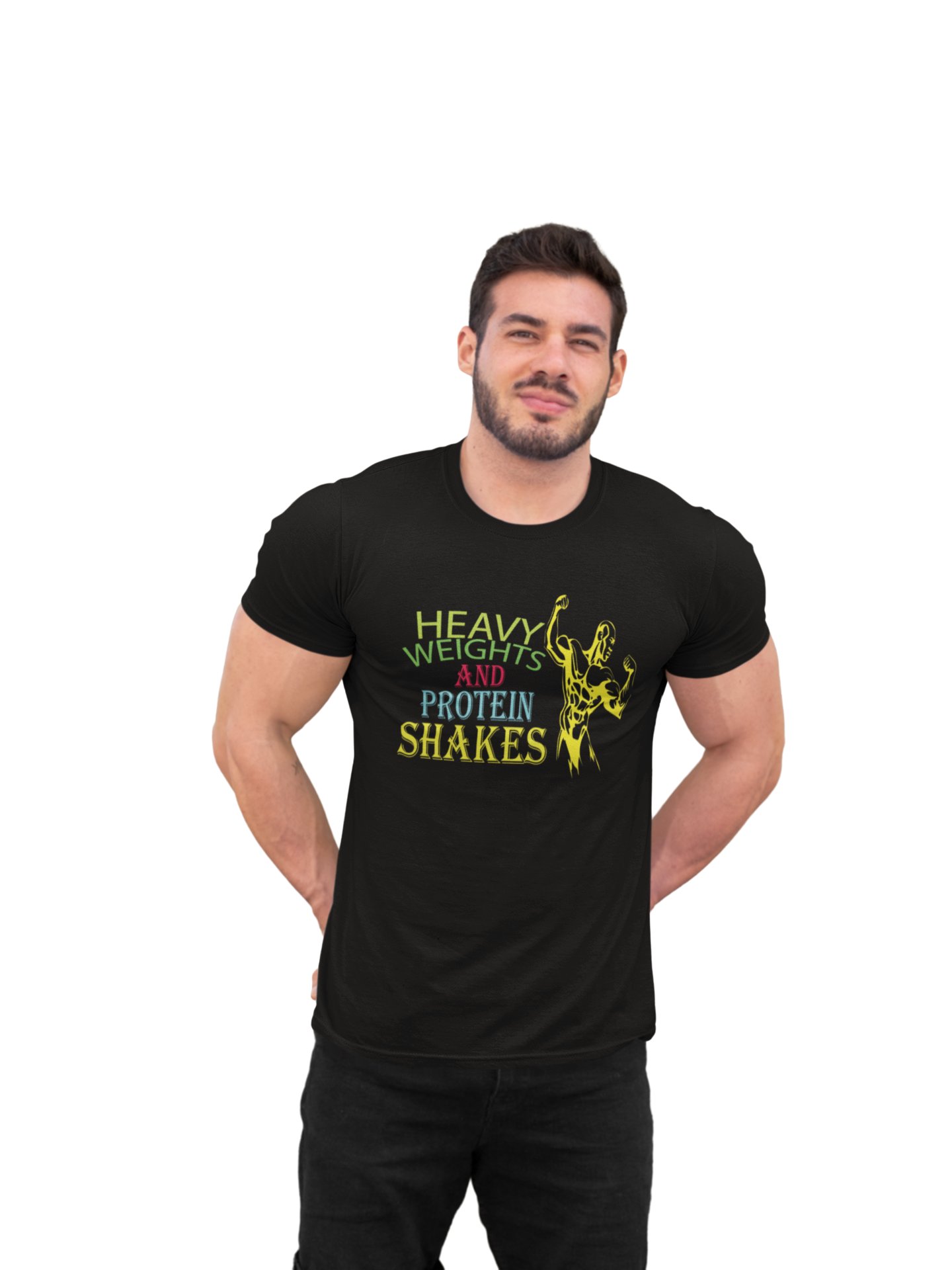 Heavy Weights and Protein Shakes Round Neck Gym Tshirt (Black Tshirt) - Clothes for Gym Lovers - Suitable for Gym Going Person - Foremost Gifting Material for Your Friends and Close Ones